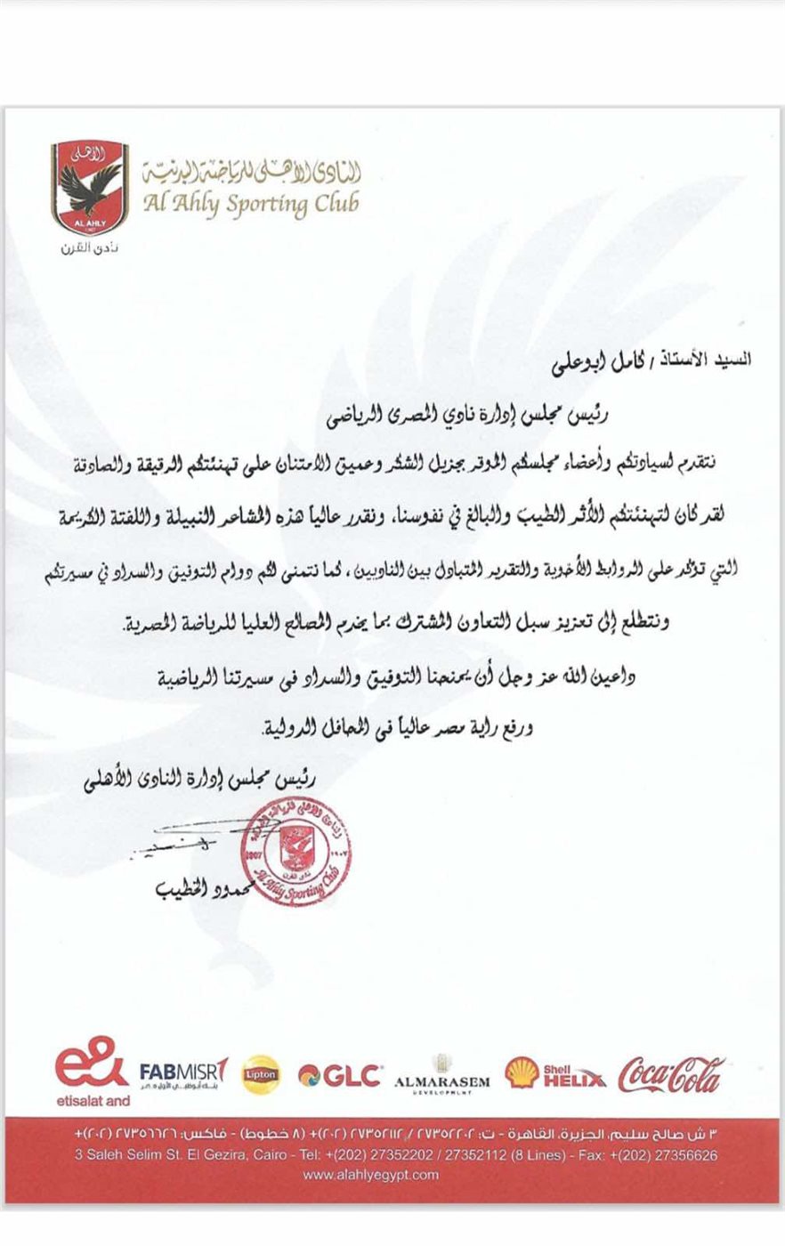وختم الأهلي خطابه بتمنياته للنادي المصري بمزيد من النجاح والتوفيق في المرحلة المقبلة لرفع راية الرياضة المصرية.