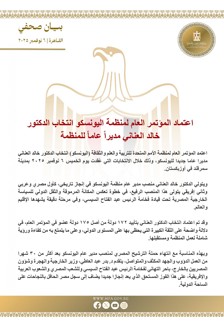 اعتمد المؤتمر العام لمنظمة الأمم المتحدة للتربية والعلم والثقافة (اليونسكو) انتخاب الدكتور خالد العناني مديرا عاما جديدا لليونسكو، وذلك خلال الانتخابات التي عُقدت يوم الخميس ٦ نوفمبر ٢٠٢٥ بمدينة سمرقند في أوزبكستان.