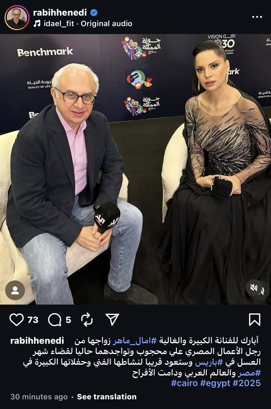 حرص الإعلامي ربيع هنيدي على تهنئة النجمة آمال ماهر بزواجها من رجل الأعمال المصري علي محجوب، وذلك خلال منشور عبر حسابه الشخصي بموقع تبادل الصور والفيديوهات “انستجرام”.