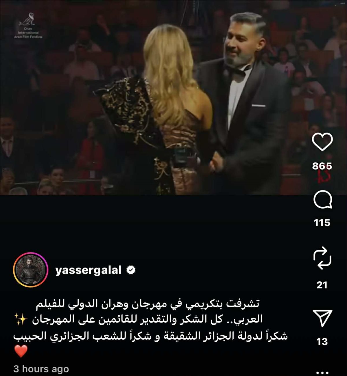 أعرب الفنان ياسر جلال عضو مجلس الشيوخ ووكيل لجنة الثقافة والإعلام والآثار عن بالغ سعادته وامتنانه لتقديره وتكريمه في مهرجان وهران الدولي للفيلم العربي، وذلك خلال منشور عبر حسابه الشخصي بموقع تبادل الصور والفيديوهات “انستجرام”.