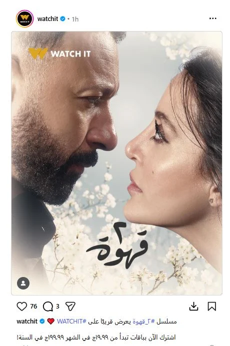 أعلنت منصة Watch it عن عرض مسلسل 2 قهوة قريبًا، وذلك من خلال نشر البوستر الترويجي للمسلسل، عبر حسابها الرسمي على موقع تبادل الصور والفيديوهات “إنستجرام”.