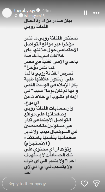 واختُتم البيان بقوله: “تؤكد روبي أن الحسابات الرسمية على مواقع التواصل الاجتماعي تُدار بواسطة فريق مختص من مسؤولي السوشيال ميديا (باستثناء إنستجرام)، وليست تحت إدارتها الشخصية"، مشيرًا إلى أن أي محتوى يُنشر على تلك الحسابات لا يستهدف أي طرف، ولا يُقصد به التلميح أو الإيذاء لأي شخص”.