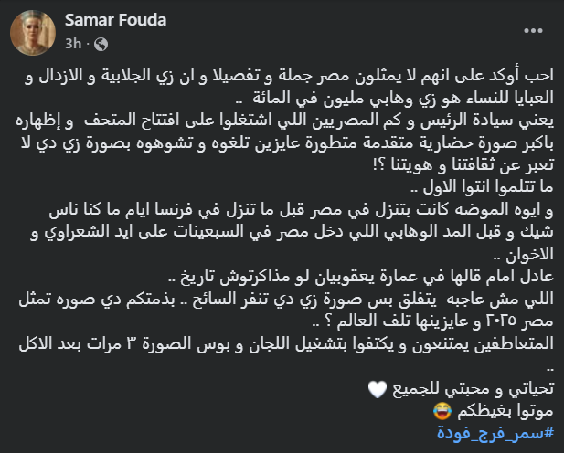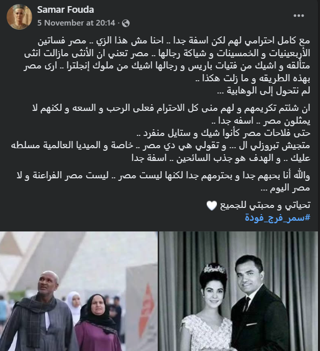 واختتمت سمر فرج فودة منشورها بتأكيدها على احترامهما ولكنهما لا يمثلان مصر، حيث قالت: “والله أنا بحبهم جدا و بحترمهم جدا لكنها ليست مصر .. ليست مصر الفراعنة و لا مصر اليوم … تحياتي و محبتي للجميع”.