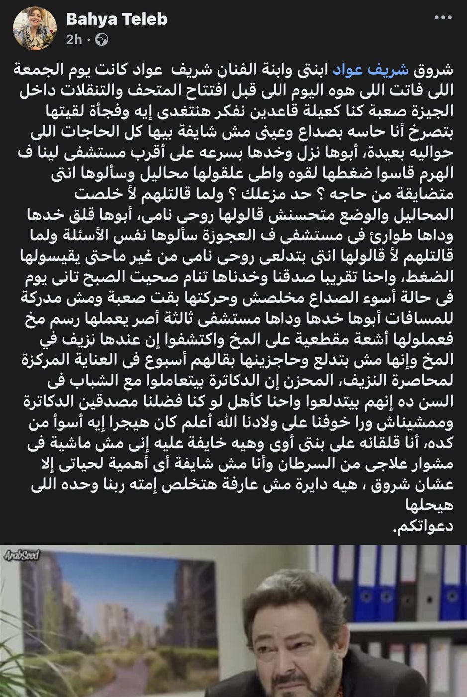 كشفت بهية طالب زوجة الفنان شريف عواد عن تعرض ابنتهما لأزمة صحية خطيرة استدعت حجزها في العناية المركزة، بسبب الإهمال الطبي، مطالبة الجمهور بالدعاء لها بالشفاء العاجل، وذلك خلال منشور عبر حسابها الشخصي بموقع التواصل الإجتماعي الأشهر “فيسبوك”.