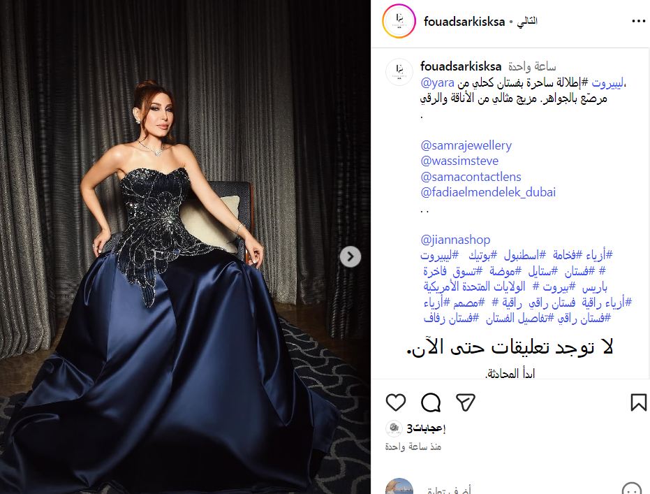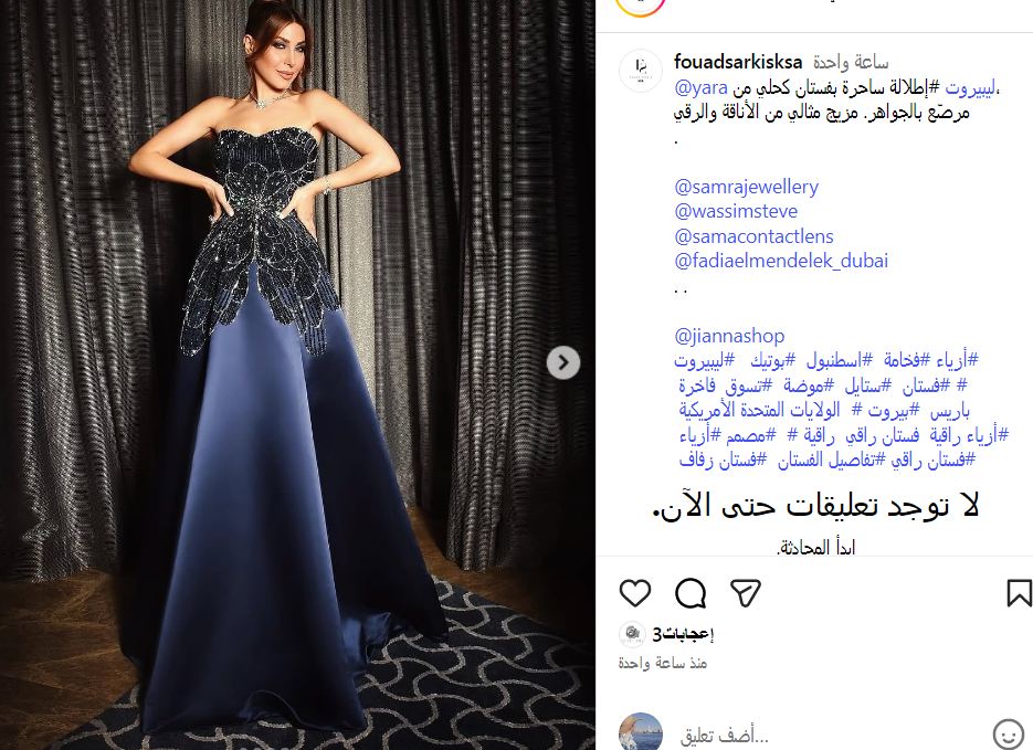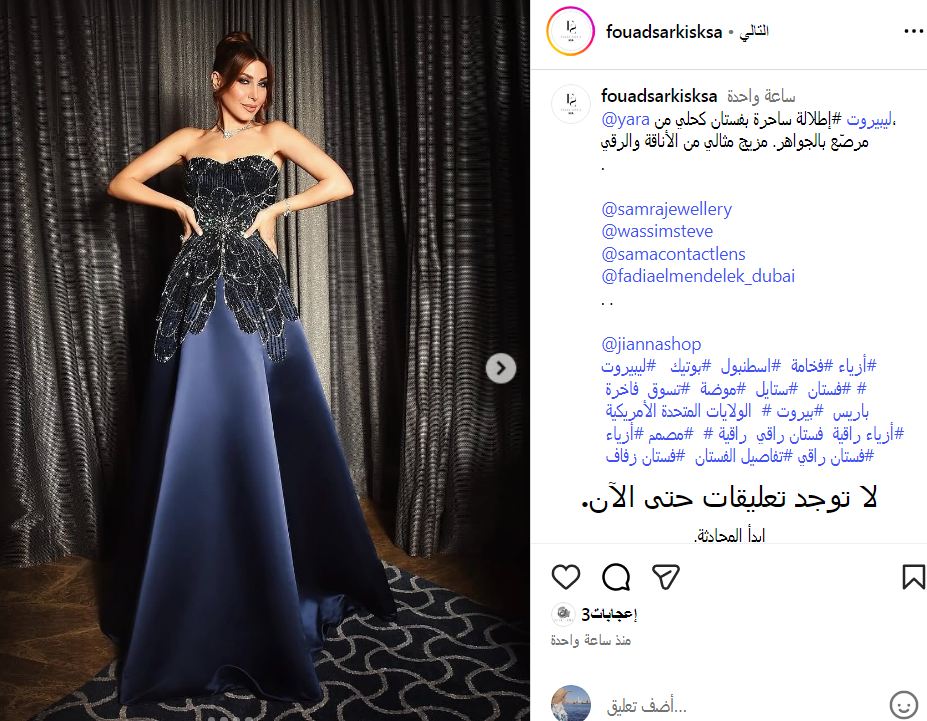 واختتم فؤاد سركيس حديثه أن الفستان حمل توقيع ماركة Li Beirut couture في بيروت ويارا من قامت بأختيار اللون الكحلي ليتناغم مع لون بشرتها الشقراء.