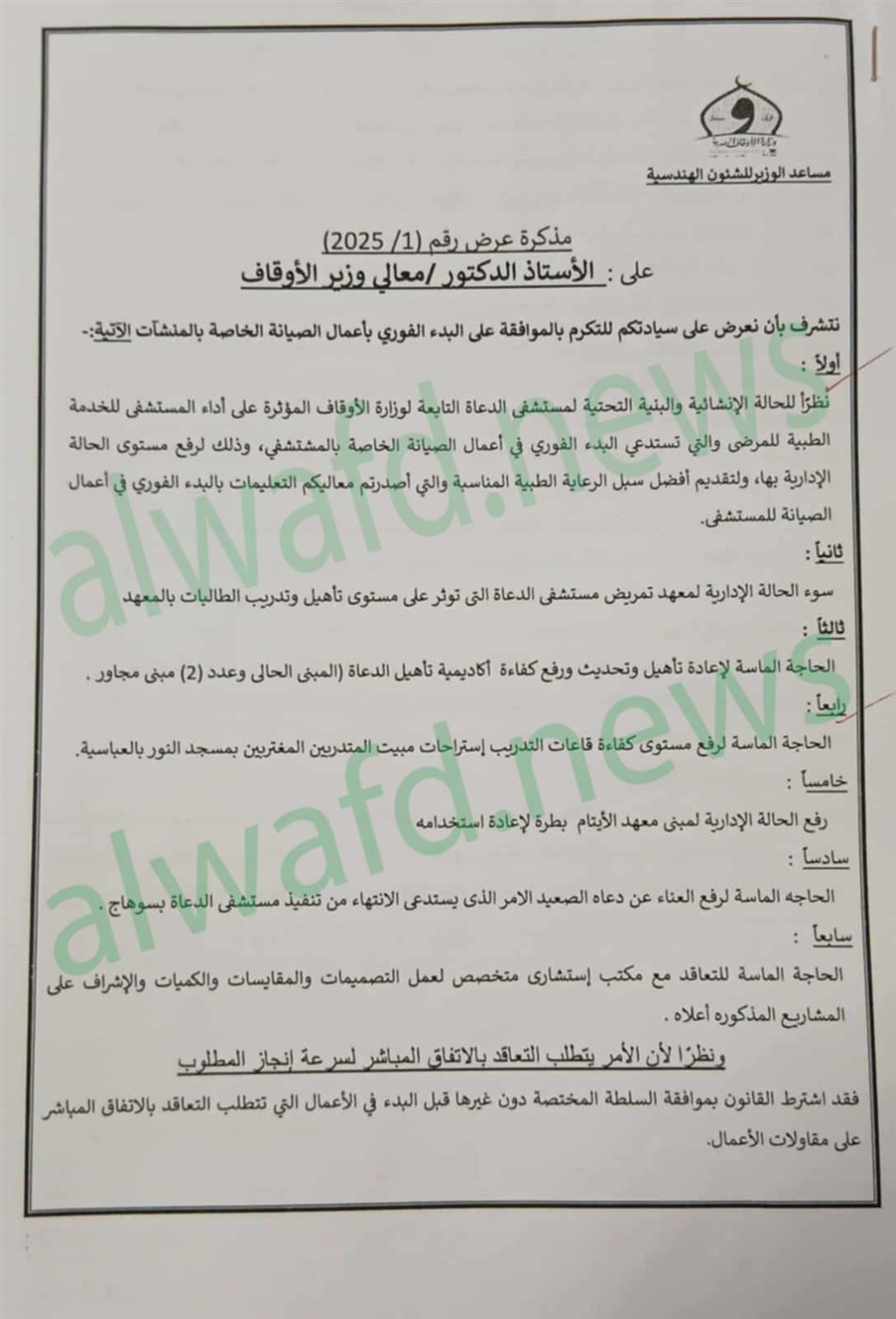 الوفد تعرض إحدى الخطابات التي عرضها مساعد الوزير على وزير الأوقاف والتي تضمنت عددا من المشروعات، منها معهد التمريض، ومعهد الأيتام بطرة، ومستشفى الدعاة بسوهاج، وأكاديمية الأوقاف للتدريب، ومستشفى الدعاة بالقاهرة، كل هذا جاء بالأمر المباشر مخالفة لقانون 182 لسنة 2018 وفقا للحالات الواردة بالمادة 62، وكما نصت المادة 20 من القانون ذاته على أن تتولى إدارة التعاقدات النشر عن الاتفاق المباشر بعد النشر على بوابة التعاقدات العامة، وهو ما لم يحدث بعد ذلك.