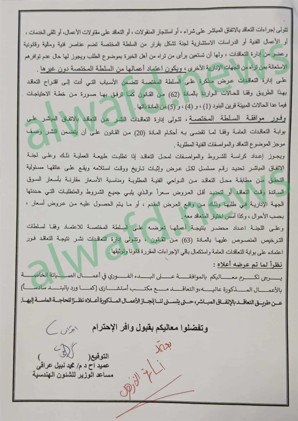 وكل ماذكر من إجراءات في المذكرة المعروضة على الوزير لم يتم أخذها في الاعتبار، وإنما تم الإسناد بالأمر المباشر في كل العمليات، بالمخالفة للقوانين وكذلك بالمخالفة لاعتماد الوزير باتباع الإجراءات القانونيه.