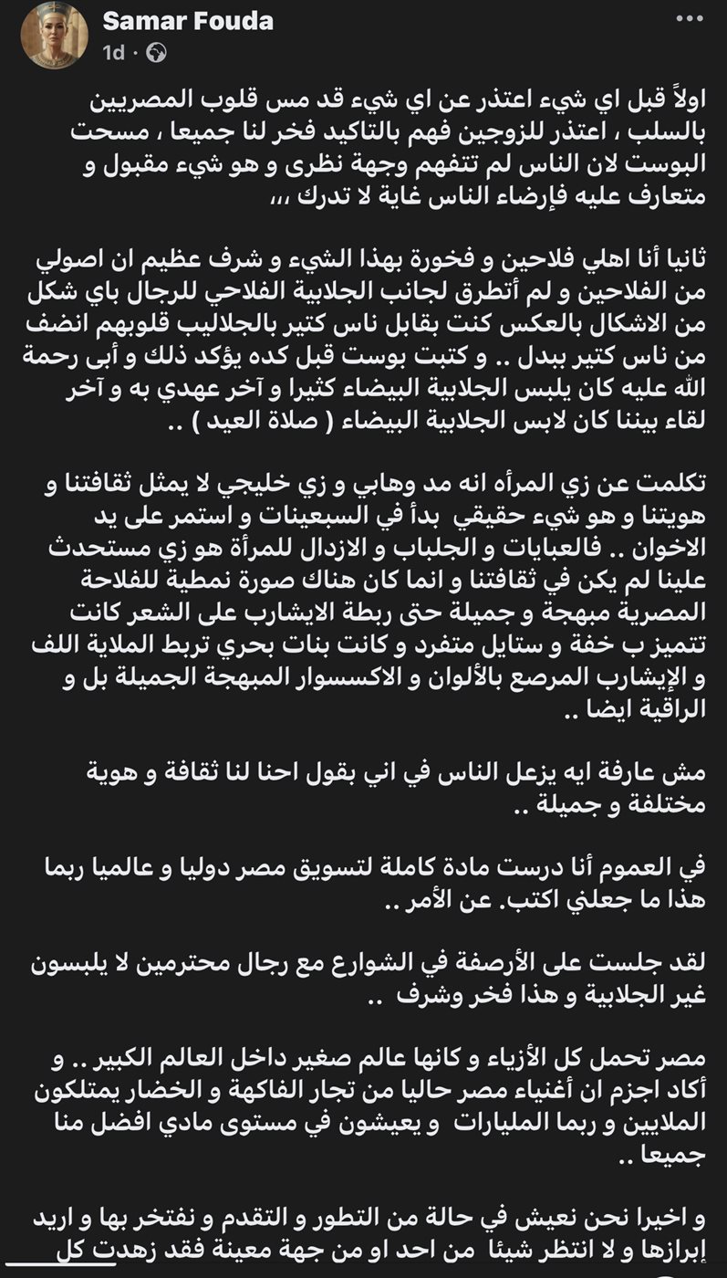 وجّهت سمر فرج فودة اعتذرًا رسميًا للمصريين بعد تصريحاتها الأخيرة عن الجلابية ورفضها التام لأن تكون هي الزي الذي يمثل مصر عالمياً، وذلك بعد انتقادها ذهاب عم رشاد وزوجته للمتحف المصري الكبير بالجلابية، ورفضها تصدير هذه الصورة عن المصريين للعالم، بحسب قولها: “هذا الزي لا يمثل مصر وينفر السائح”.