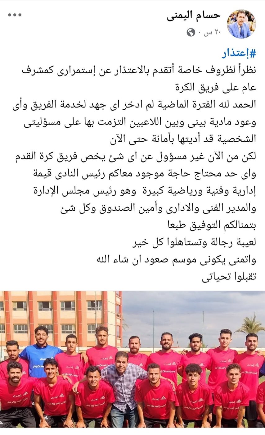 وتصاعدت الأزمة مؤخرًا بعد إعلان الدكتور حسام اليمني اعتذاره عن الإشراف على فريق الكرة، في خطوة أثارت تساؤلات واسعة حول مستقبل الفريق.