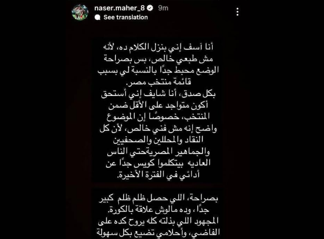 وقال ناصر ماهر عبر حسابه الرسمي على موقع التواصل الإجتماعي “انستجرام”: “ أنا آسف إني بنزل الكلام ده، لأنه مش طبعي خالص، بس بصراحة الوضع محبط جداً بالنسبة لي بسبب قائمة منتخب مصر ”.