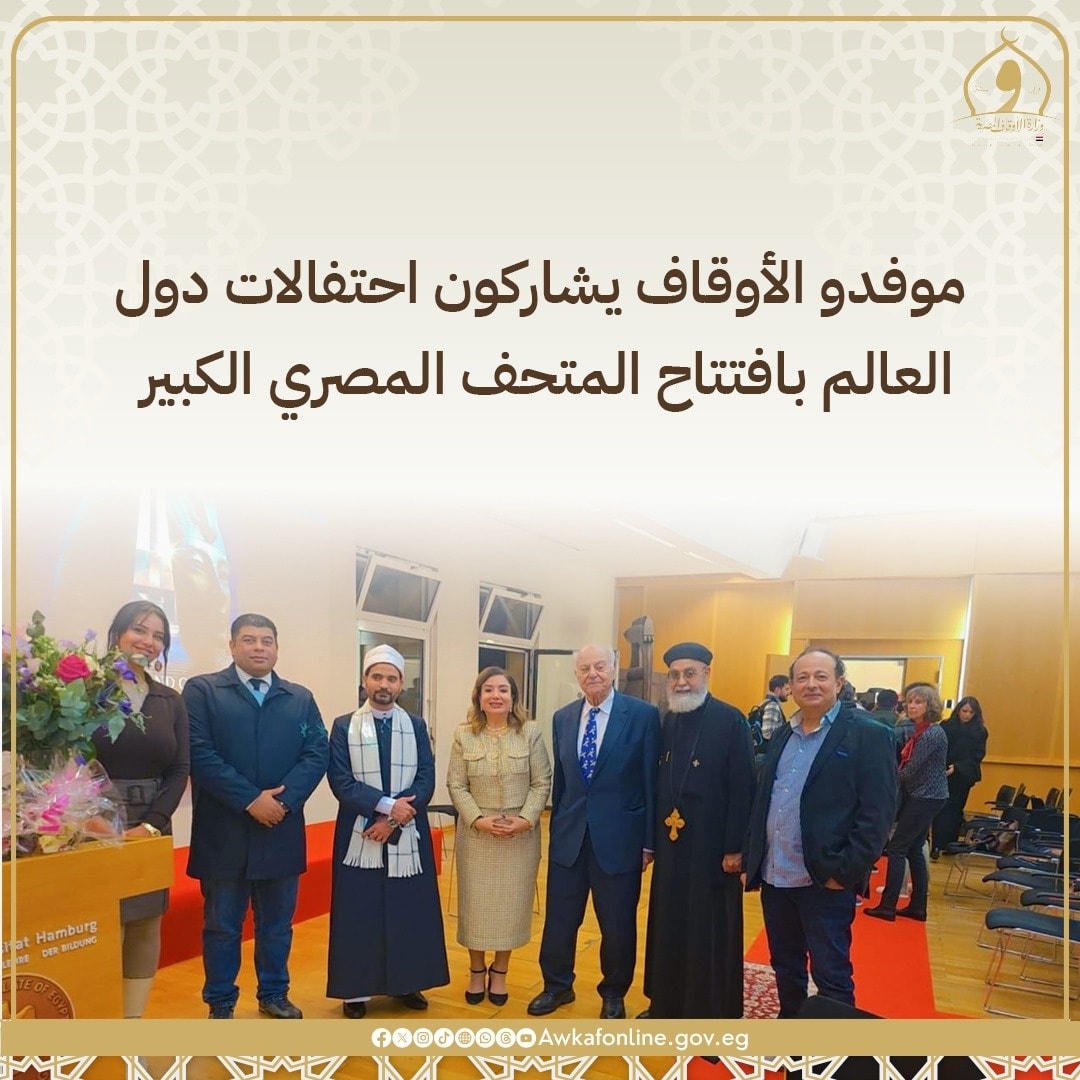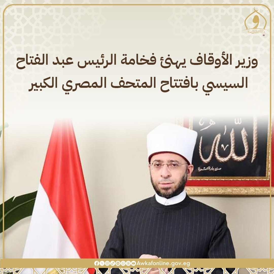 في مستهل أنشطته، وجّه وزير الأوقاف الدكتور أسامة الأزهري تهنئة رسمية إلى فخامة الرئيس عبد الفتاح السيسي والشعب المصري العظيم، بمناسبة افتتاح المتحف المصري الكبير، واصفًا هذا الحدث بأنه “إعادة لإحياء روح مصر الخالدة وإشعاع حضارتها الإنسانية عبر العصور”.