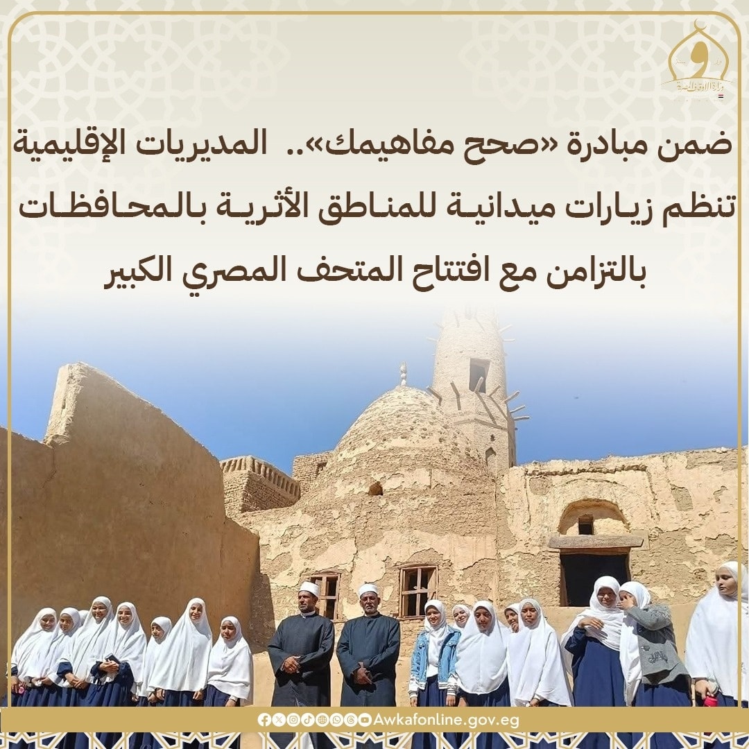 في إطار المبادرة التوعوية الرائدة «صحح مفاهيمك»، نظّمت مديرية أوقاف الوادي الجديد زيارة ميدانية للمناطق الأثرية بمدينة القصر الإسلامية، بمشاركة أئمة ودعاة وطلاب من الأزهر الشريف، لتعريفهم بتاريخ مصر الإسلامي وترسيخ قيم الاعتدال والاعتزاز بالهوية.
