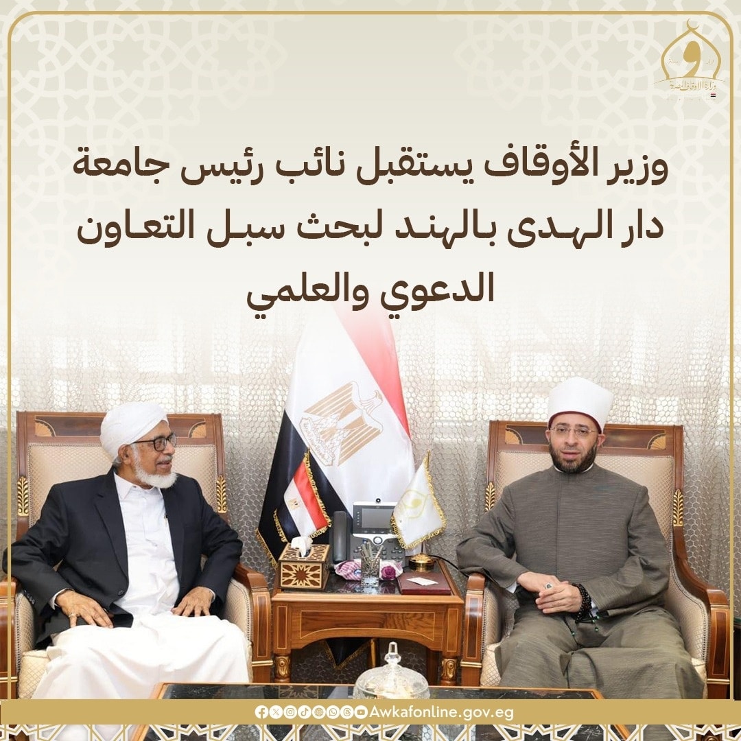 استقبل الوزير الدكتور أسامة الأزهري كلًا من الوزير المكلف بالشئون الإسلامية في سنغافورة ونائب رئيس جامعة دار الهدى بالهند، لبحث أوجه التعاون الدعوي والعلمي، وتبادل الخبرات في تدريب الأئمة ونشر الفكر الوسطي عالميًا.