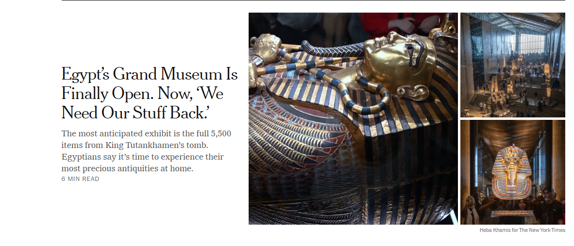 تسلط صحيفة نيويورك تايمز الأمريكية الضوء على مطالب المصريين باستعادة الآثار المصرية المُهربة خارج البلاد، وذلك تزامنًا مع افتتاح المتحف المصرى الكبير.