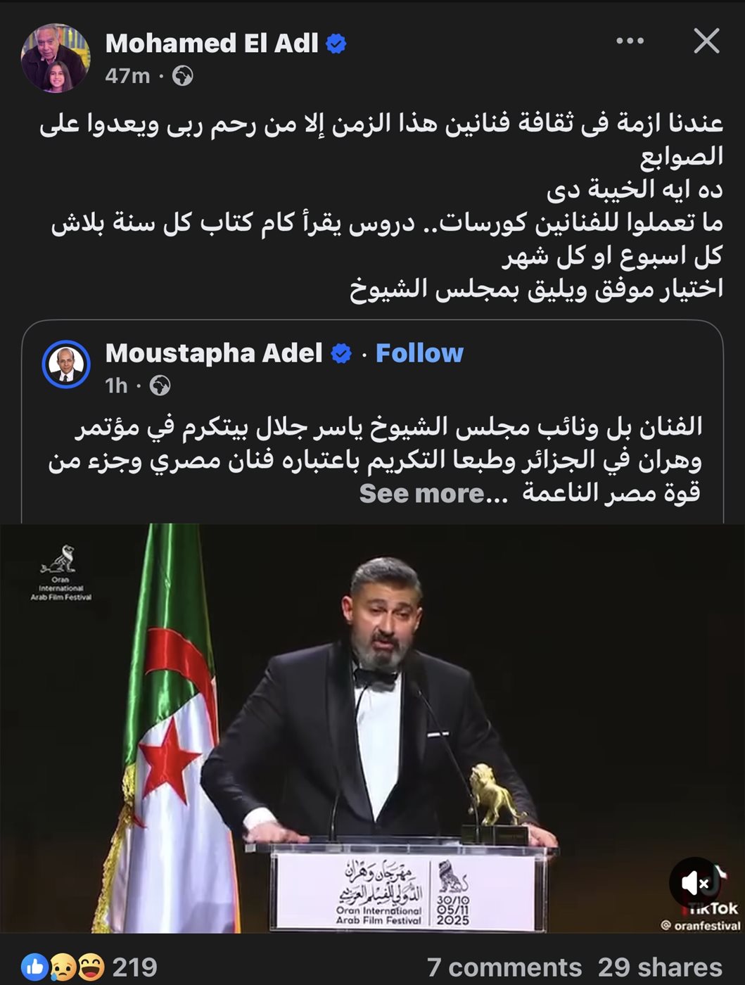 هاجم المنتج محمد العدل الفنان ياسر جلال بعد تصريحاته الأخيرة عن الجيش الجزائري التي أدلى بها مؤخرًا خلال تكريمه في مهرجان وهران الدولي للفيلم العربي بالجزائر، وذلك خلال منشور عبر حسابه الشخصي بموقع التواصل الإجتماعي الأشهر “فيس بوك”.