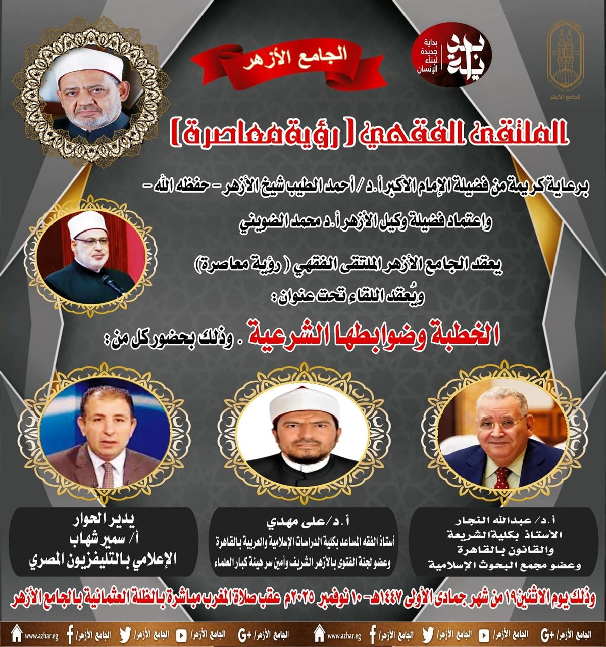 يعقد غدًا الجامع الأزهر الملتقى الفقهي بين الشرع والطب الخامس والثلاثون بعنوان "رؤية معاصرة"، والذي يناقش على مائدته: الخطبة وضوابطها الشرعية "رؤية فقهية".