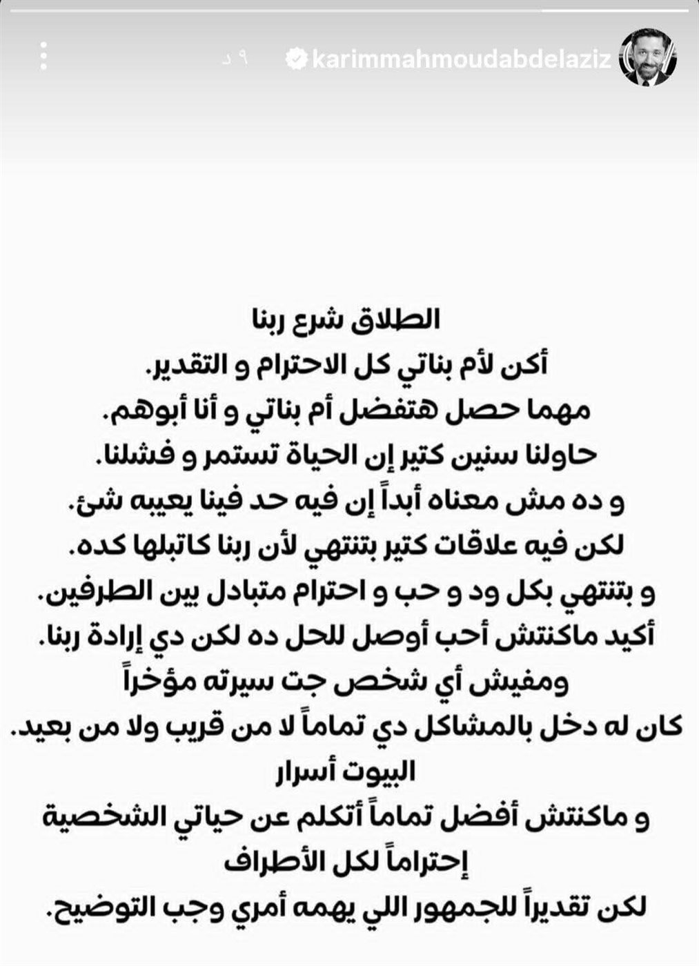 وقال كريم في بيان رسمي نشره عبر حسابه على موقع إنستجرام إنه انفصل عن زوجته آن الرفاعي بعد سنوات من الزواج، موضحاً أن الطلاق تم في إطار من الاحترام المتبادل، ودون وجود أي طرف ثالث.