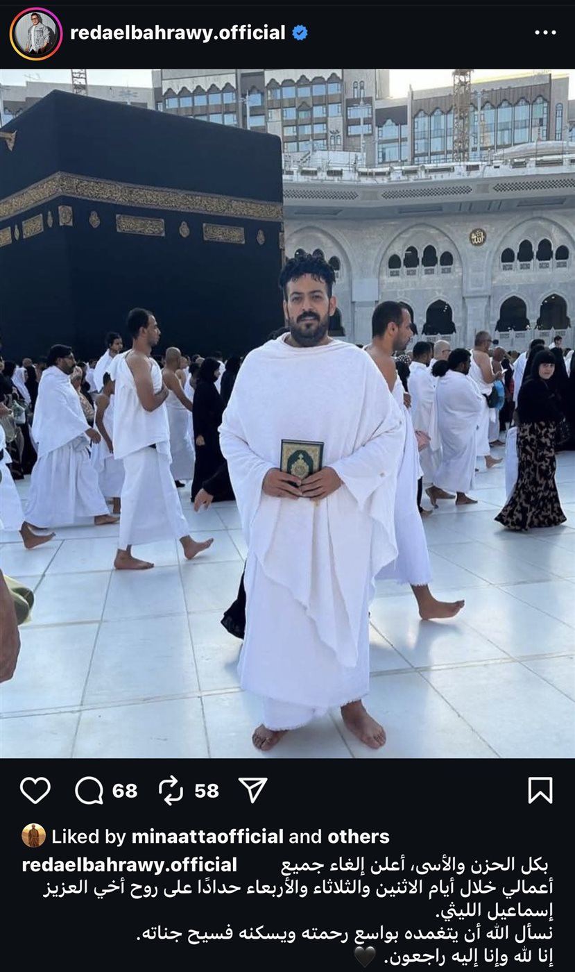 نشر رضا البحراوي صورة المطرب الراحل إسماعيل الليثي، وأرفقها بتعليق قائلًا: “بكل الحزن والأسى، أعلن إلغاء جميع أعمالي خلال أيام الاثنين والثلاثاء والأربعاء حدادًا على روح أخي العزيز إسماعيل الليثي”.