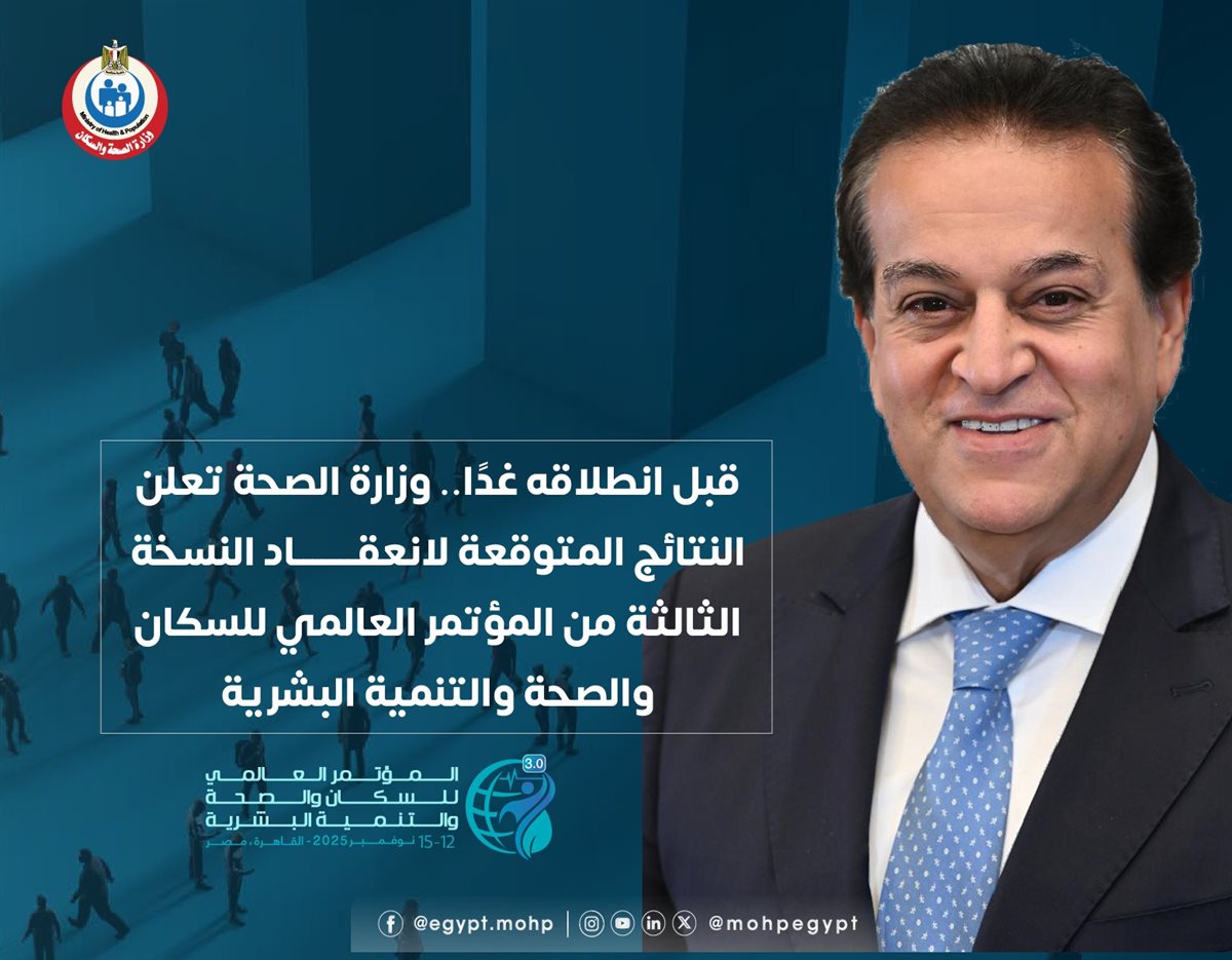 أعلنت وزارة الصحة والسكان أن النسخة الثالثة من المؤتمر العالمي للصحة والسكان والتنمية البشرية (PHDC 2025)، والتي تنطلق صباح غدٍ الأربعاء، ستُسفر عن حزمة من النتائج الاستراتيجية التي ستُعيد رسم ملامح التنمية البشرية وتعزز جودة الحياة على المستويات المحلية والإقليمية والدولية.