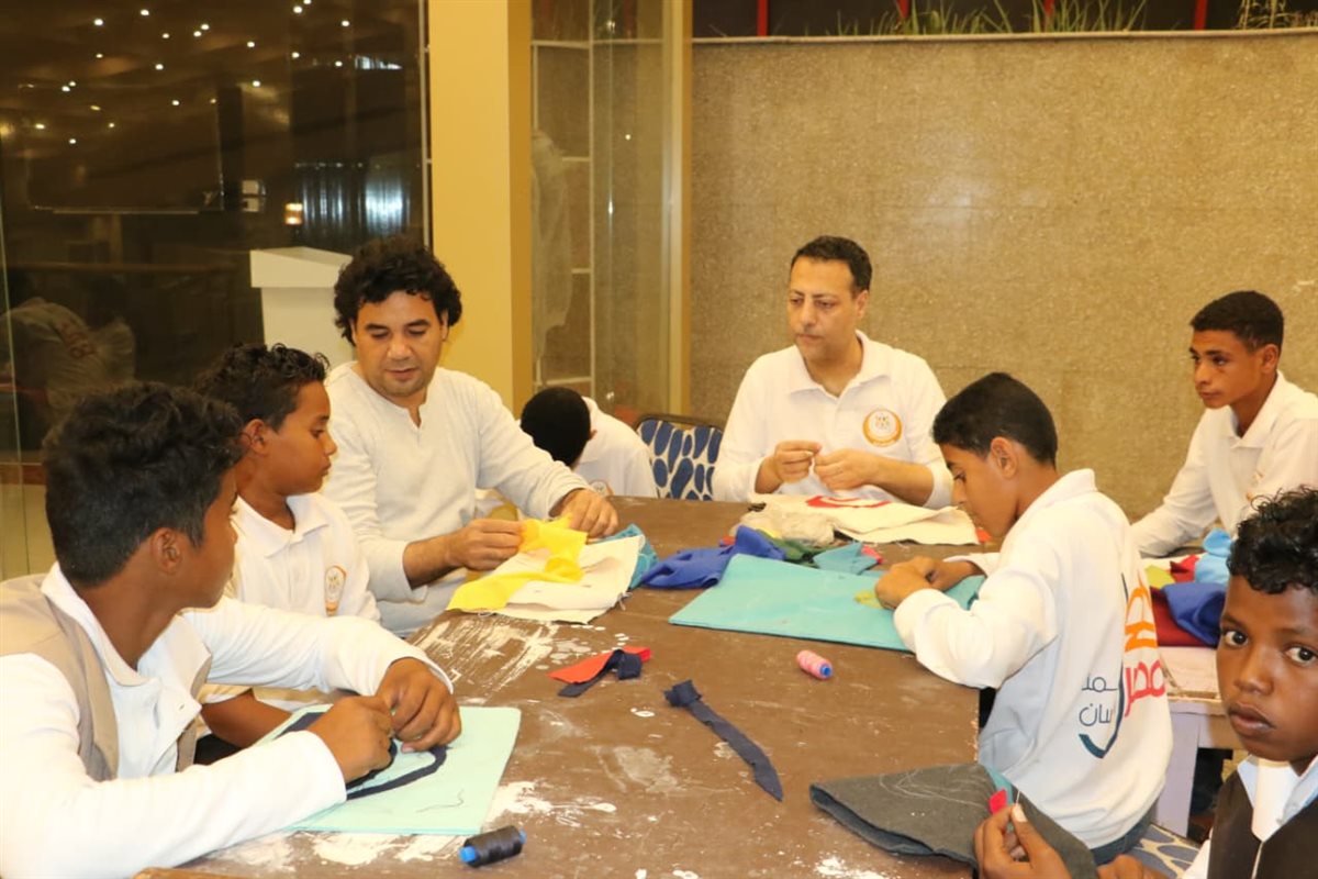 كما استكملت المدربة منى عبد الوهاب في ورشة الشنط بالخرز تدريب الأطفال على تنفيذ شنط يدوية باستخدام الغرزة الرباعية وتنسيق الألوان، بينما واصلت المدربة إيمان نوح في ورشة إعادة التدوير تدريبهم على استغلال الخامات المستعملة لصنع لوحة تعبر عن حضارة مصر القديمة.