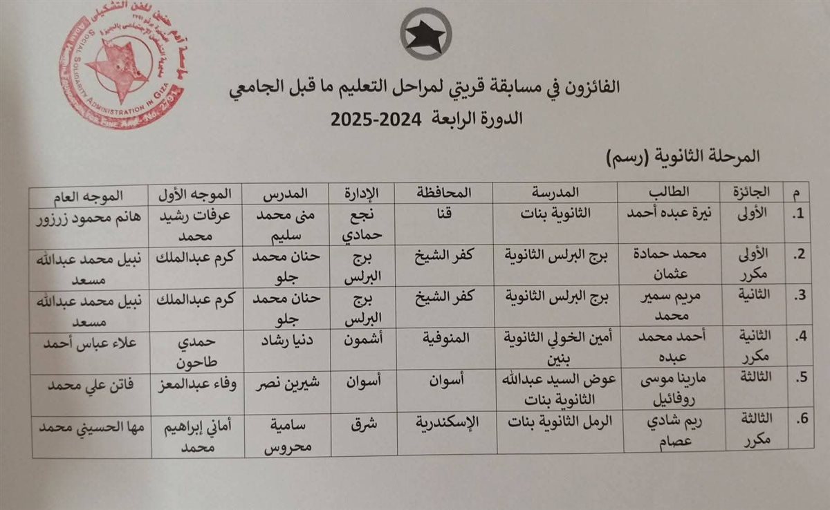 أعلن هانى عنتر الصابر وكيل وزارة التربية والتعليم بقنا، فوز الطالبة نيرة عبده أحمد بمدرسة الثانوية بنات التابعة لادارة نجع حمادى التعليمية، بالجائزة الأولى، في نتيجة مسابقات آدم حنين لمراحل التعليم قبل الجامعي في دورتها الثامنة، ومسابقة قريتي في دورتها الرابعة 2024/2025 م والتى أجريت فعالياتها بإشراف الدكتورة رباب عبدالمحسن مستشار التربية الفنية بالوزارة، والدكتور وائل النجمي مدير عام التعليم العام بالمديرية.