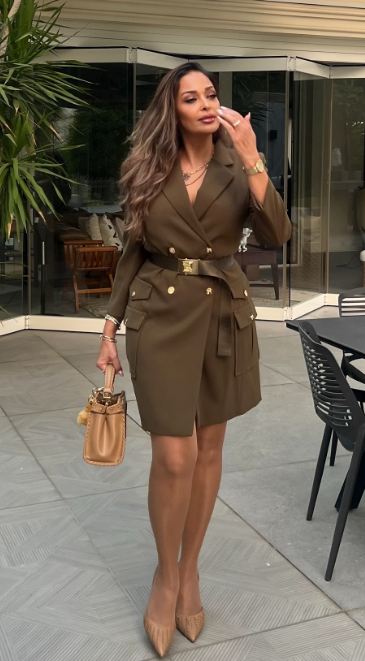 وبدت داليا البحيري بإطلالة عصرية، مرتدية فستان قصير، بأكمام طويلة، ينتمي لصيحة فساتين البليزر لتواكب موضة فساتين خريف 2025، صمم من قماش ناعم باللون الزيتي وزين بالأزرار الذهبية من الأمام، فيما انتعلت حذاءٍ بكعبٍ عالٍ.