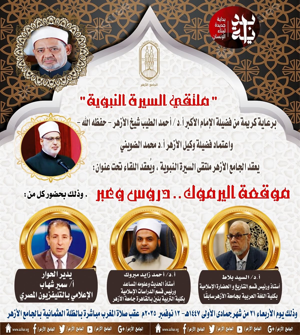 يعقد الجامع الأزهر غداً ملتقى السيرة النبوية السادس والثلاثون، والذي يناقش على مائدته: "موقعة اليرموك.. دروس وعبر".