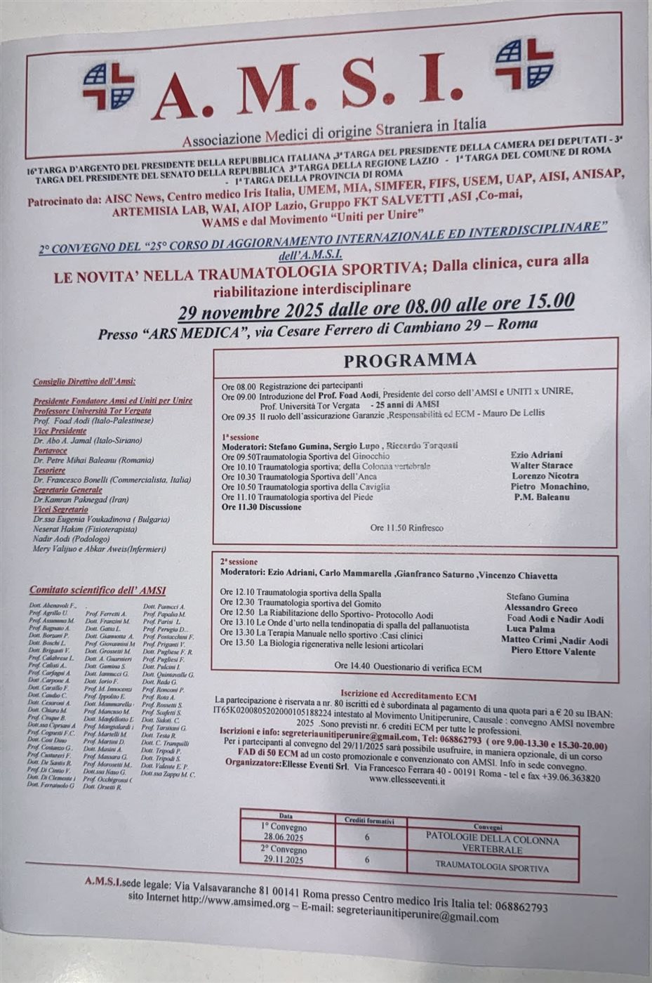 أعلنت نقابة الأطباء من أصول أجنبية في إيطاليا (AMSI) عن انعقاد المؤتمر الثاني للدورة التدريبية الدولية الخامسة والعشرين متعددة التخصصات، والمخصصة هذا العام لطب الإصابات الرياضية والابتكار في إعادة التأهيل المتكامل، وذلك يوم السبت 29 نوفمبر 2025 من الساعة 8:00 صباحًا حتى الساعة 3:00 مساءً، في مركز آرس ميديكا روما (Via Cesare Ferrero di Cambiano, 29).