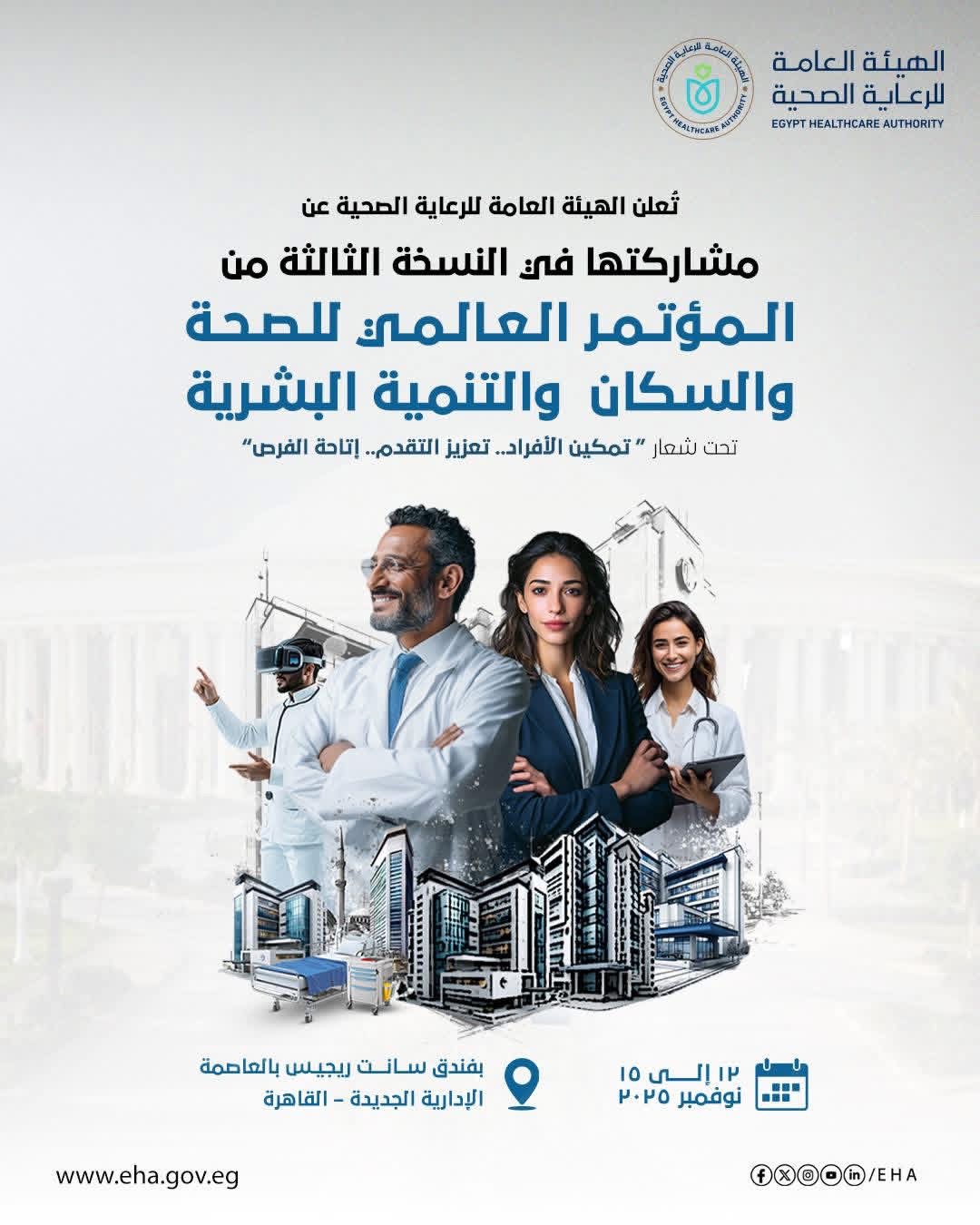 تُعلن الهيئة العامة للرعاية الصحية عن مشاركتها خلال فتره من 13 إلي 15 نوفمبر، في النسخة الثالثة من المؤتمر العالمي للصحة و السكان والتنمية البشرية تحت شعار “تمكين الأفراد.. تعزيز التقدم.. إتاحة الفرص” المقرر انعقاده خلال الفترة من 12 إلى 15 نوفمبر 2025، تحت رعاية كريمة من السيد الرئيس عبد الفتاح السيسي، رئيس جمهورية مصر العربية, وذلك بفندق سانت ريجيس بالعاصمة الإدارية الجديدة – القاهرة.