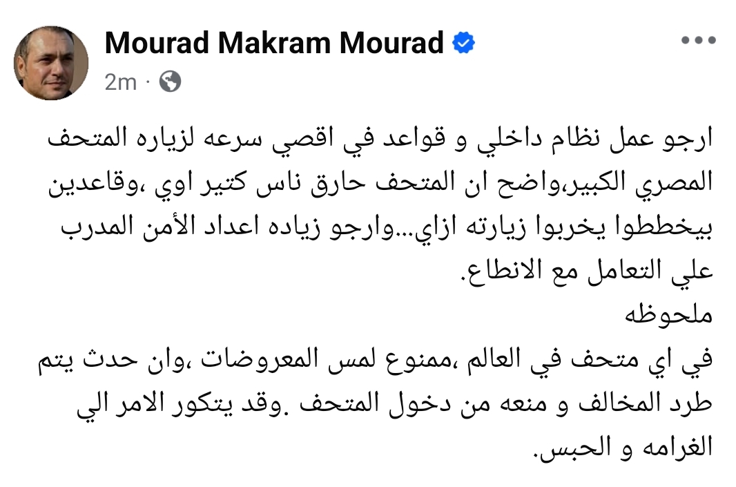 طالب الفنان مراد مكرم عبر منشور على صفحته الرسمية بموقع "فيسبوك" بسرعة وضع نظام داخلي وقواعد واضحة تنظم زيارة المتحف المصري الكبير، وذلك لوجود محاولات من البعض للإساءة لتجربة زيارة هذا الصرح الثقافي المهم، مؤكدًا أن هناك من "يحترقون غيظًا" من نجاح المتحف ويخططون للإضرار بسمعته.