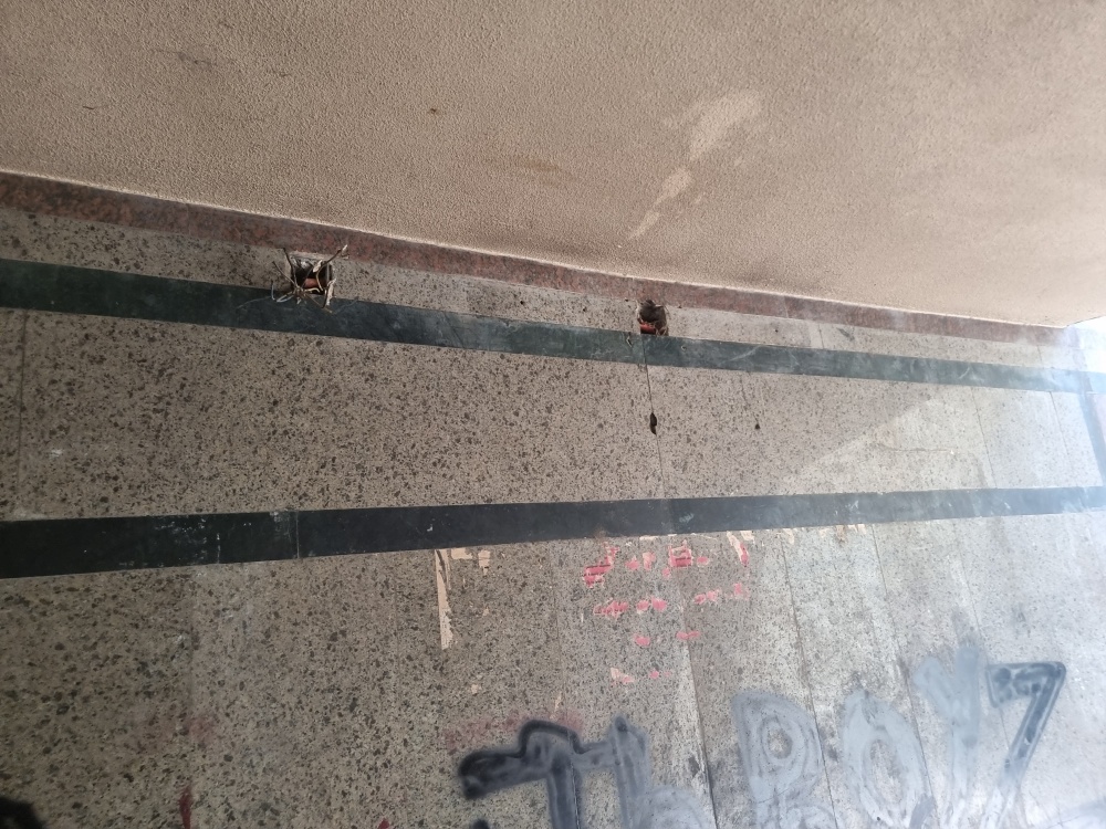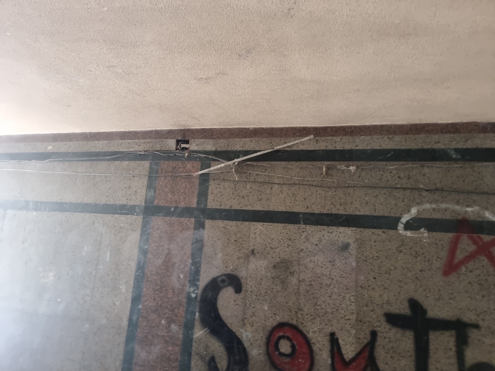 كما تظهر في بعض الأماكن آثار ثقوب وفجوات عميقة في الجدران والسقف نتيجة لنزع أو سقوط بعض التجهيزات الكهربائية، تاركة وراءها فراغات غير معالجة وبؤر سوداء.