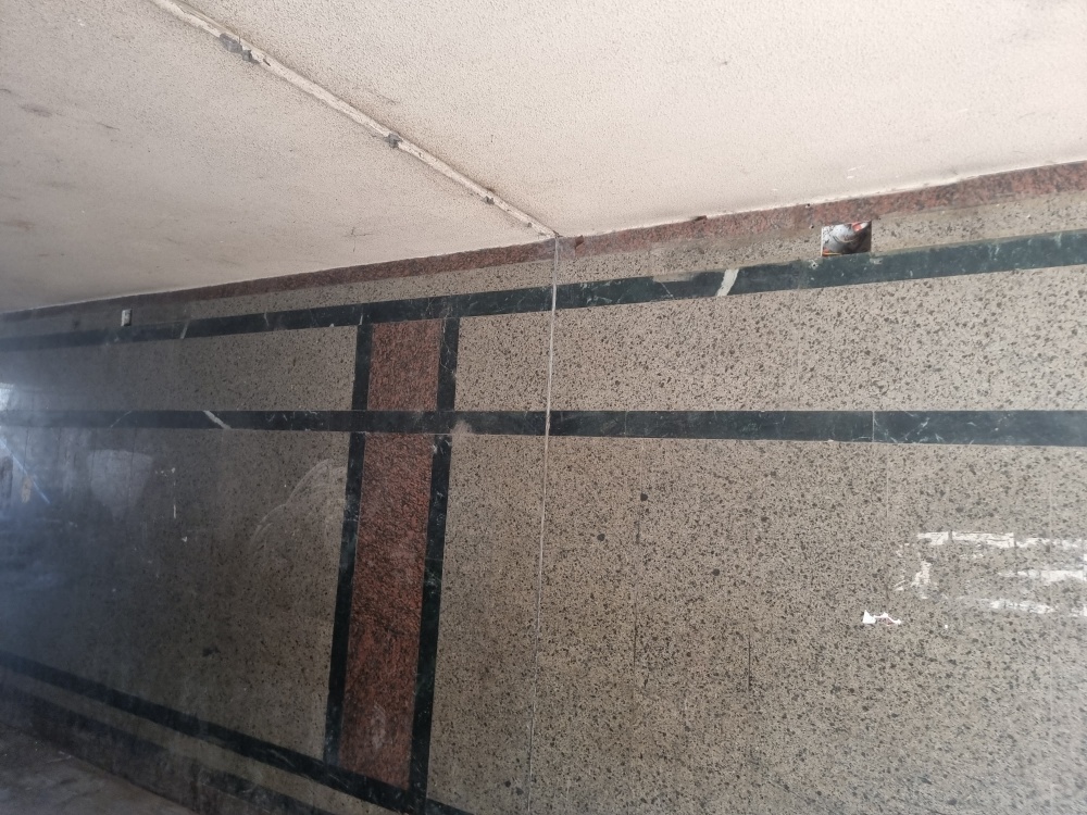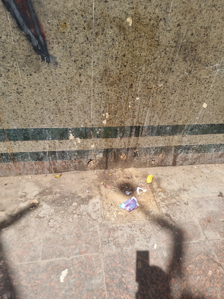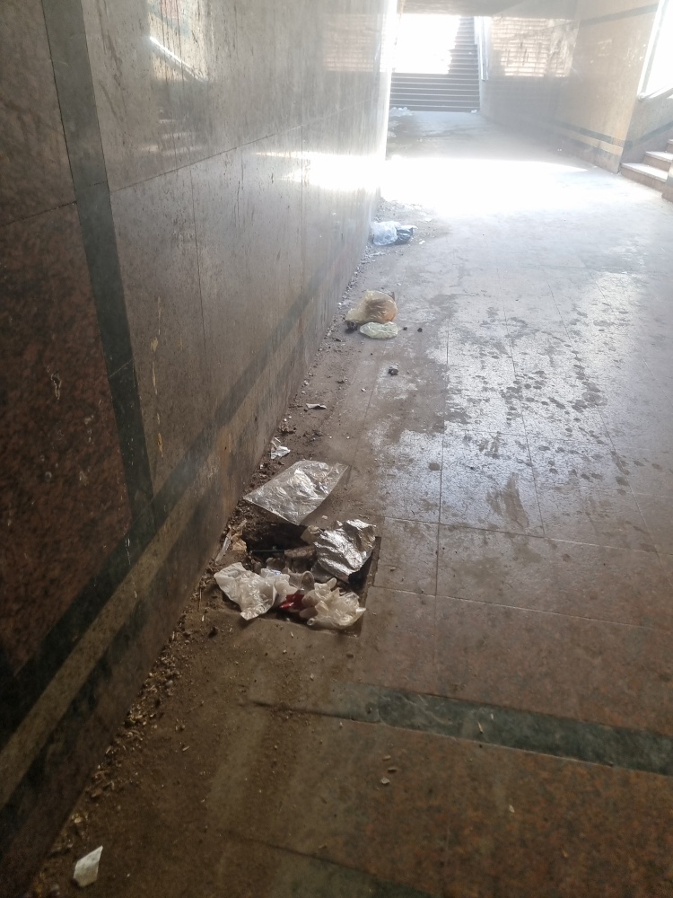 من جانب آخر، تعاني الجدران المغطاة بالجرانيت من تشوهات بصرية وتخريب واضح. فالحوائط الملطخة بالسوائل والأوساخ المتراكمة تتخللها رسومات جرافيتي وكتابات عشوائية تزيد من مظهر التدهور العام.