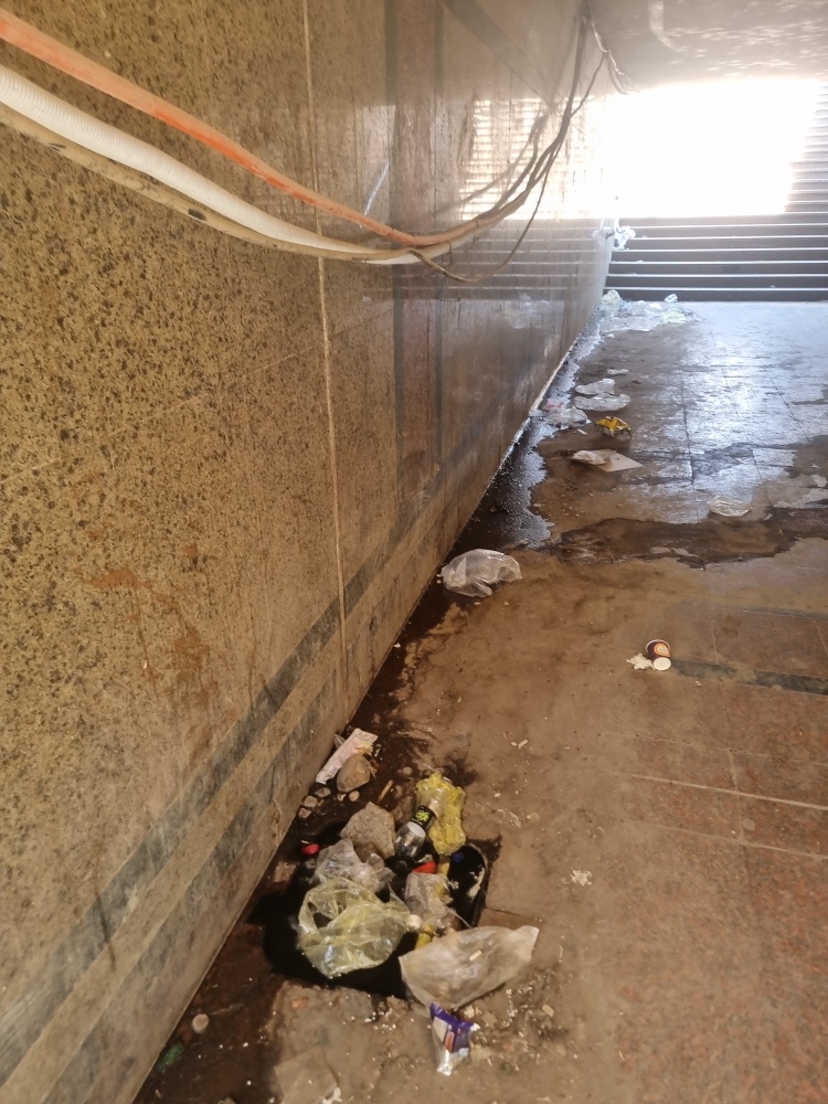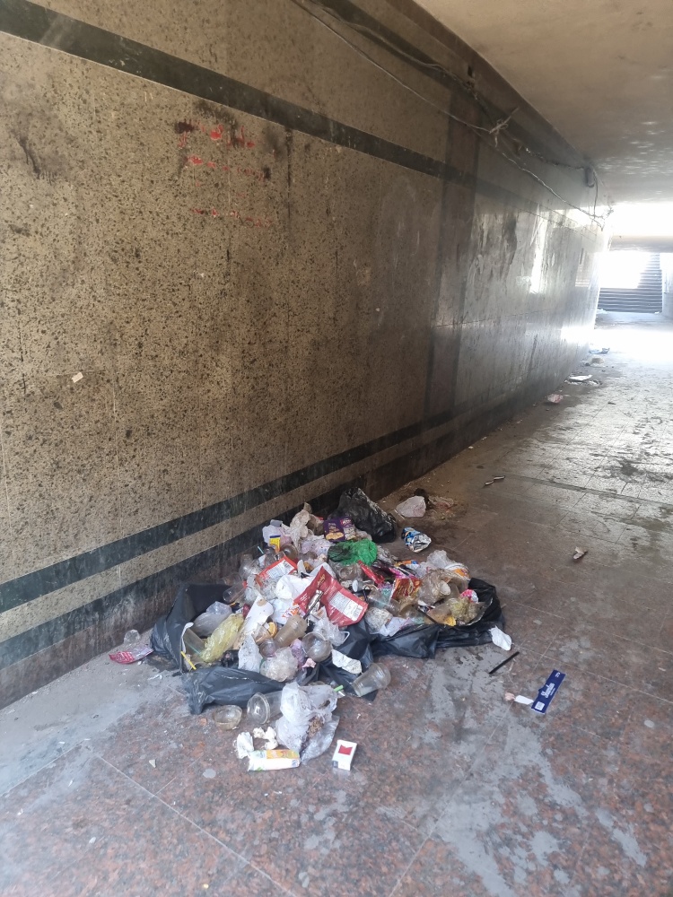 المشهد الأكثر هيمنة والأشد فداحة داخل نفق الزهراء للمشاة بأسيوط هو التراكم العشوائي والهائل للنفايات والمخلفات، لم يعد الأمر مقتصرا على إلقاء نفايات فردية بل تحول إلى أكوام متراكمة من القمامة في نقاط متعددة وزوايا النفق.