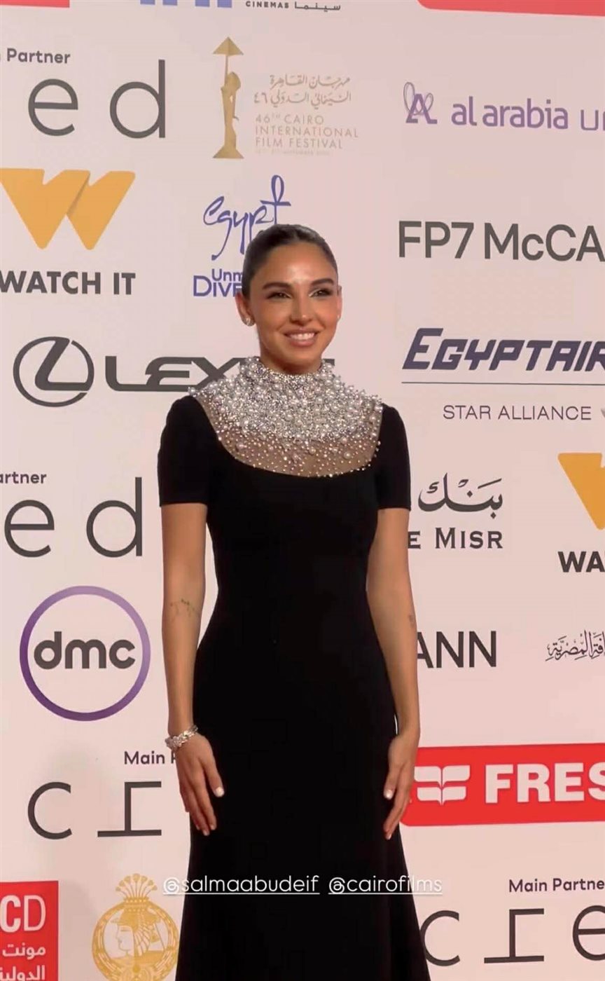 افتتاح مهرجان القاهرة السينمائي.. سلمى ابو ضيف تتألق بالأسود المرصع باللؤلؤ