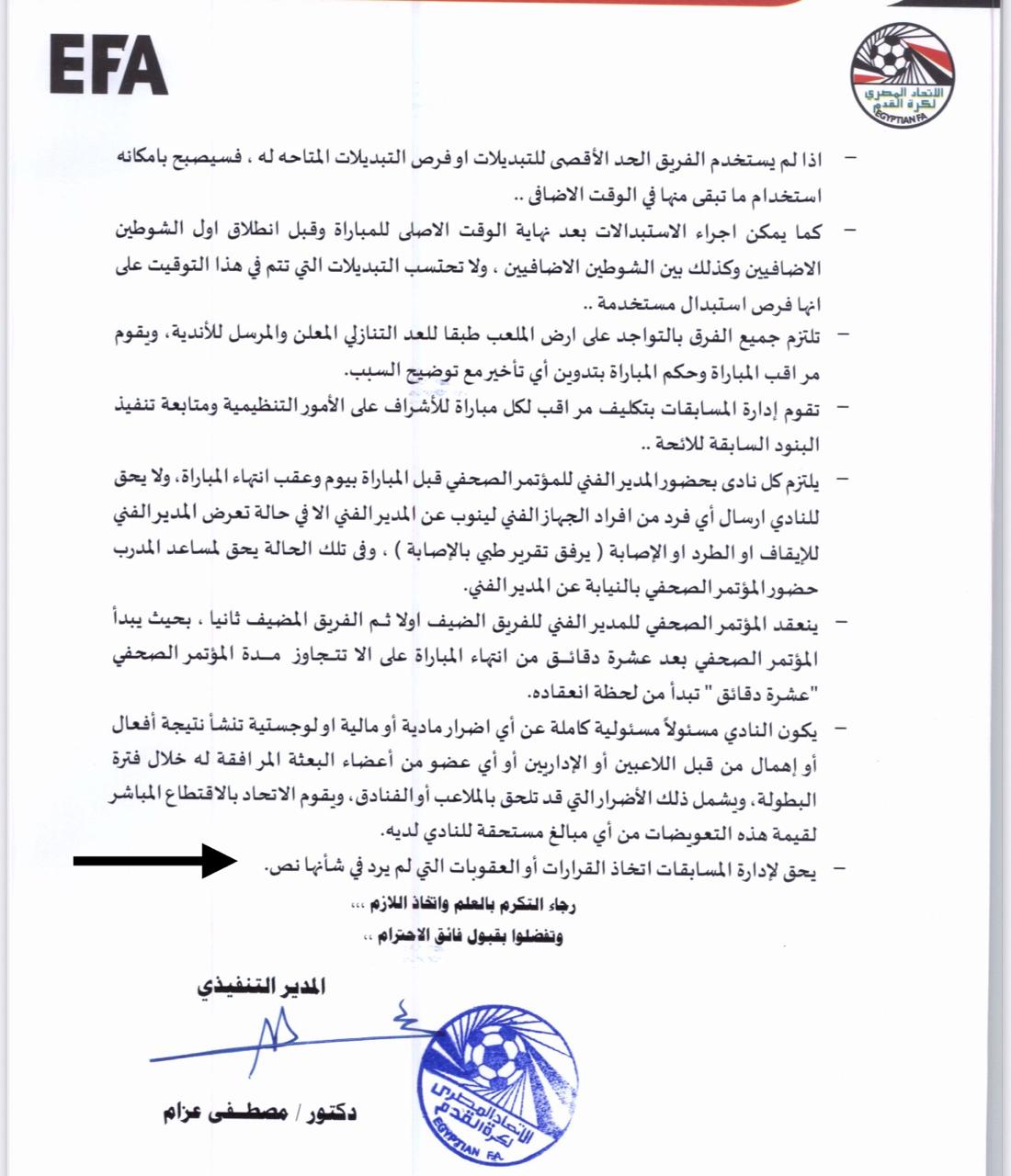 “يحق لإدارة المسابقات اتخاذ القرارات أو العقوبات التي لم يرد في شأنها نص”، وهو ما يعطي الحق للجنة في اتخاذ الإجراءات أو العقوبات وفقًا لرؤيتها حتى لو لم تكن مُدرجة ضمن لائحة عقوبات السوبر.
