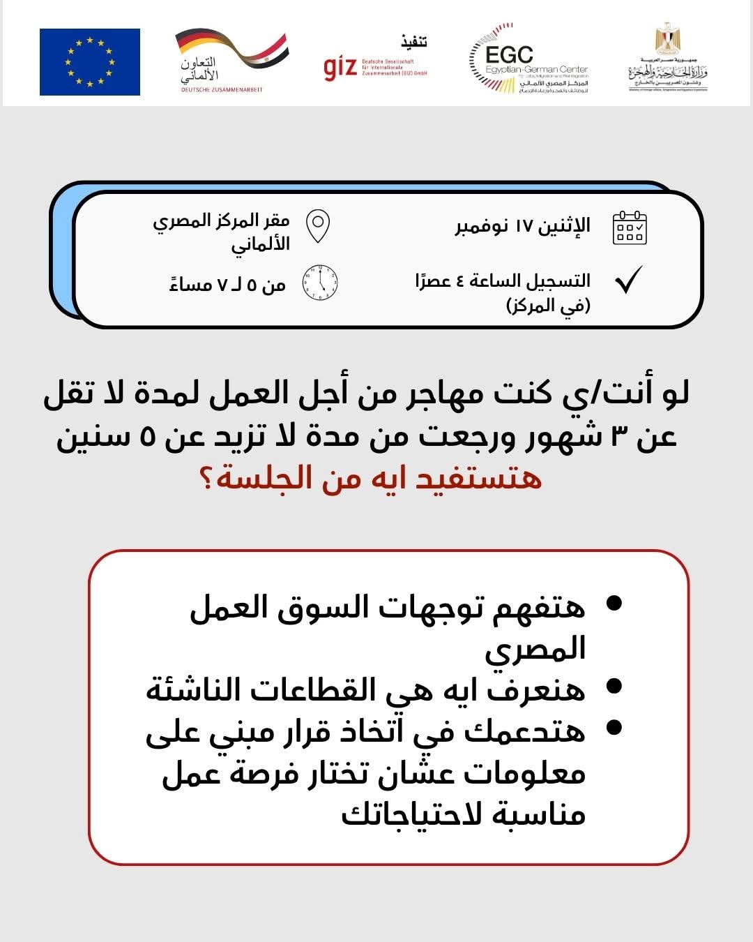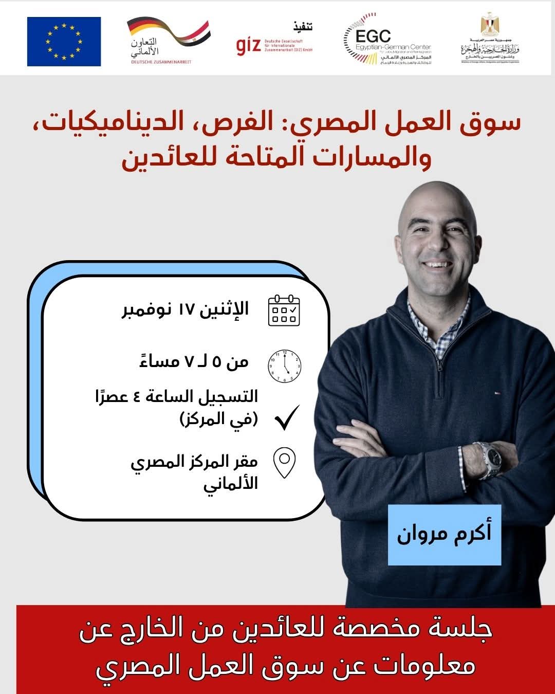 يأتي في إطار جهود وزارة الخارجية والهجرة وشئون المصريين بالخارج لدعم المصريين العائدين من الخارج وتعزيز اندماجهم في سوق العمل المحلي، ينظم المركز المصري الألماني للوظائف والهجرة وإعادة الإدماج، بالتعاون مع الوكالة الألمانية للتعاون الدولي (GIZ)، جلسة تعريفية بعنوان "سوق العمل المصري: الفرص والمتطلبات المتاحة للعائدين"، يقدمها أكرم مروان، مؤسس منصة iCareer، وذلك يوم الإثنين 17 نوفمبر بمقر المركز في سرايات المعادي.
