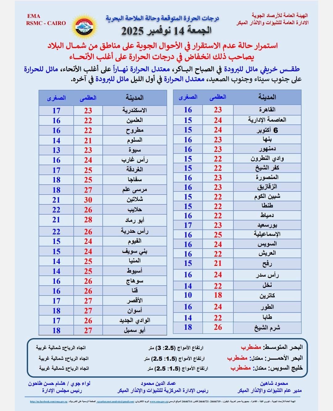 مع استمرار انخفاض درجات الحرارة على أغلب الأنحاء، يسود طقس غير مستقر اليوم الجمعة الموافق 14 نوفمبر، كما توقعت الهيئة العامة للأرصاد الجوية سقوط أمطار متفاوتة الشدة على السواحل الشمالية الشرقية والغربية والوجه البحري.