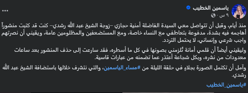 نشرت الإعلامية ياسمين الخطيب منشورًا عبر حسابها الرسمي على موقع فيسبوك، كشفت فيه كواليس اعتذارها عن الهجوم الذي كانت شنته أخيرًا على الشيخ عبدالله رشدي.