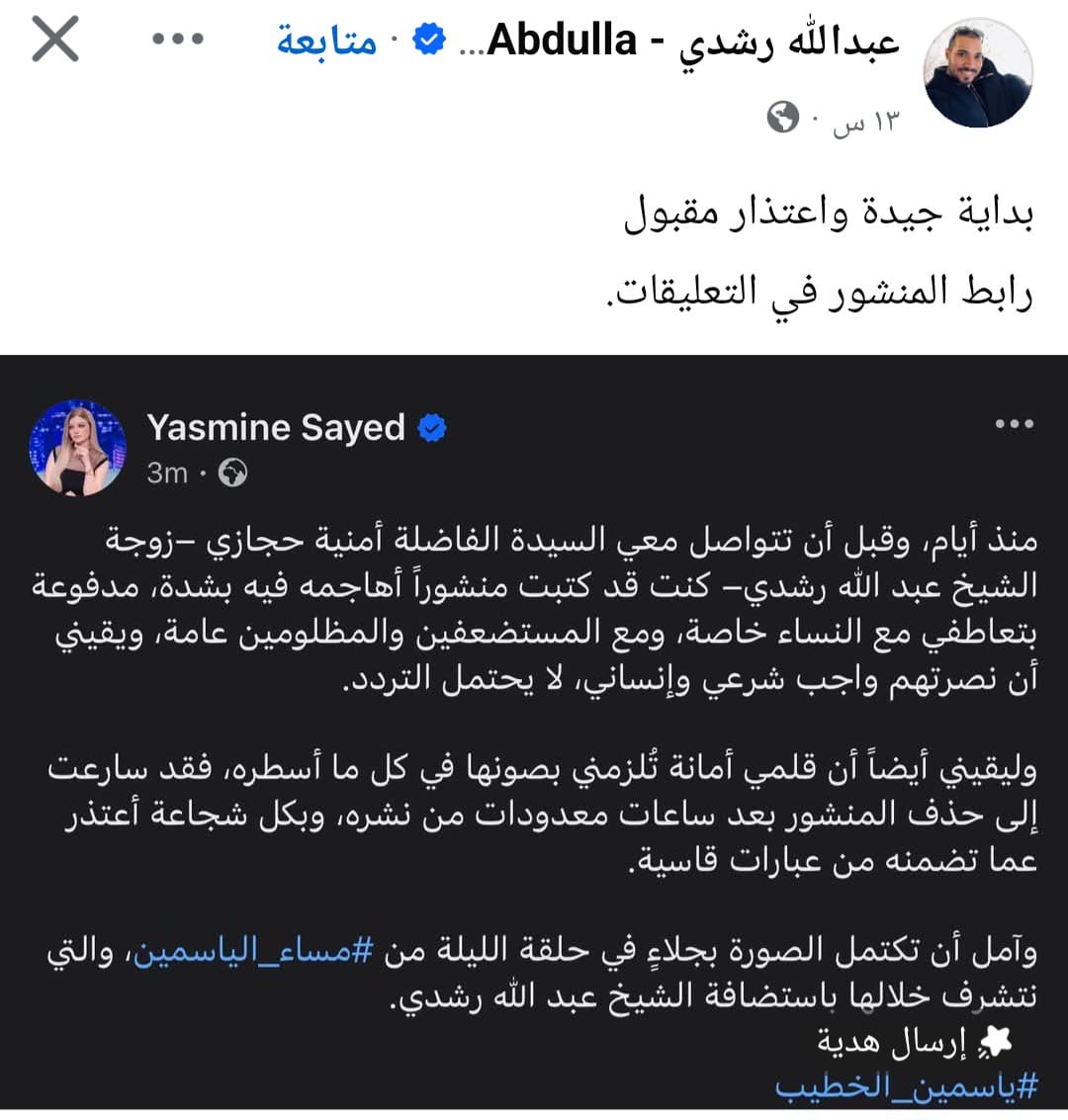 وحرصت ياسمين الخطيب على توجيه اعتذارها لعبدالله رشدي قبل إذاعة حلقتها معه، ليقبل الأخير الاعتذار، ويُقر بذلك خلال منشور عبر حسابه الشخصي بموقع “فيسبوك”.