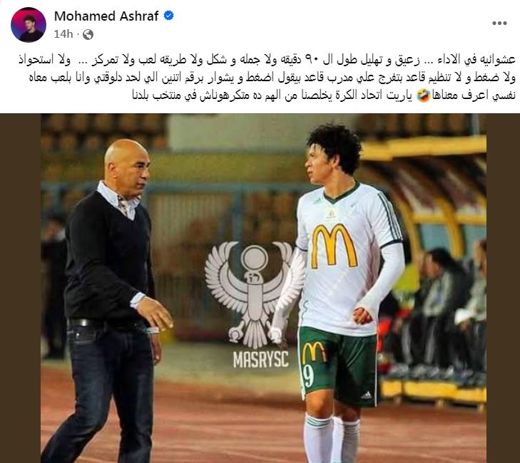 وقال محمد أشرف عبر حسابه الرسمي على موقع التواصل الاجتماعي “فيسبوك”: “عشوائية في الاداء، زعيق وتهليل طول الـ٩٠ دقيقه ولا جملة وشكل ولا طريقه لعب ولا تمركز ولا استحواذ ولا ضغط ولا تنظيم”.