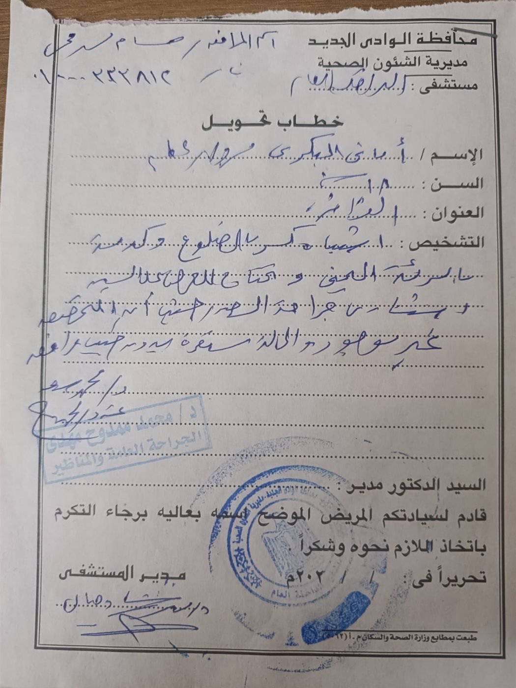 شملت الحالات المحولة أماني بكر مروان البالغة من العمر 21 سنة والمقيمة بأبو هريرة، الفرافرة، والتي تعاني من كسر في الضلوع وتم نقلها إلى مستشفى أسيوط الجامعي لمتابعة طبيب جراحة قلب وصدر.