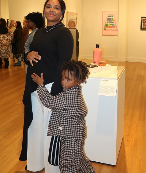 ويشاركها اللحظة ابنها نايجل بريكس ثورنتون البالغ من العمر 5 سنوات الذي يحتضن والدته بحنان أمام أعمالها المعروضة في معرض يحمل عنوان “شارع هانكوك”.