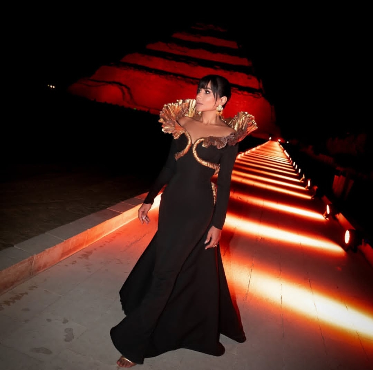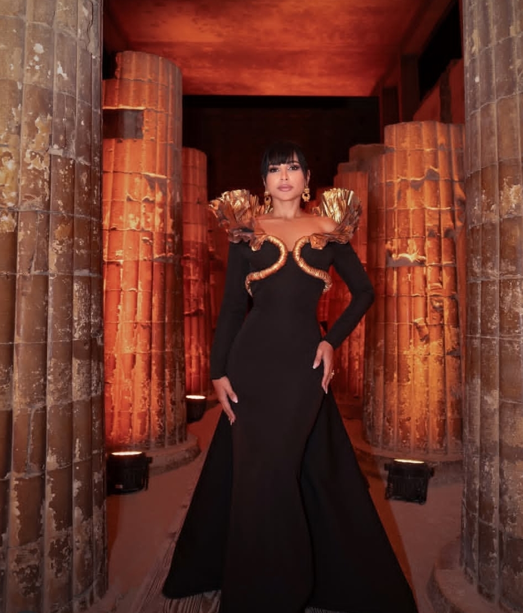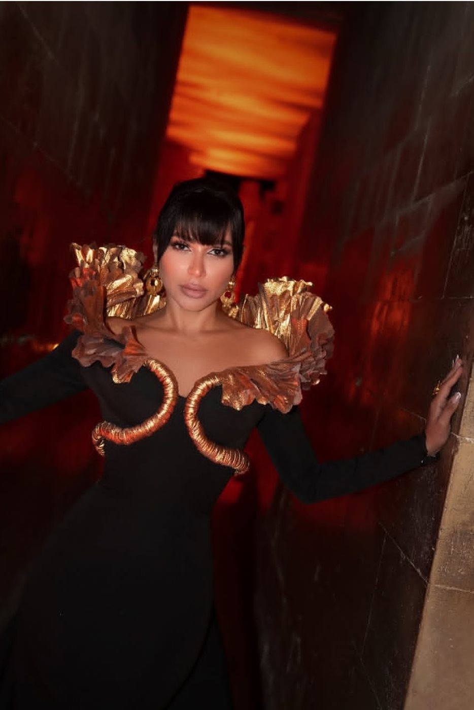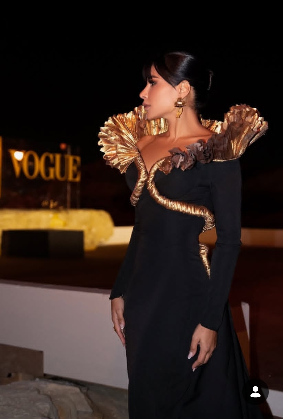 وتألقت مهيرة عبدالعزيز بإطلالة ساحرة، مزجت بين الفخامة والأناقة في آن واحد، مرتديه فستان طويل مجسم، بأكمام طويلة، صمم من قماش الكريب باللون الأسود مع الذهبي عكس سحر قوامها الممشوق، ينتمي الفستان لمجموعة خريف وشتاء 2026.