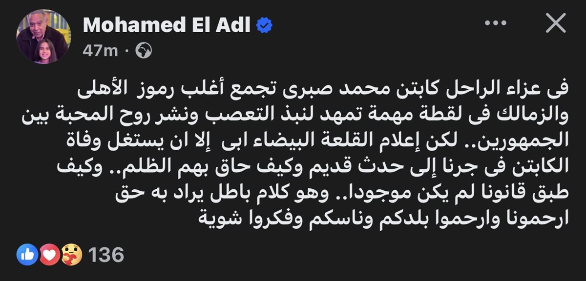 كتب محمد العدل عبر حسابه الشخصي بموقع التواصل الاجتماعي الأشهر “فيسبوك”: “فى عزاء الراحل كابتن محمد صبرى تجمع أغلب رموز الأهلى والزمالك فى لقطة مهمة تمهد لنبذ التعصب ونشر روح المحبة بين الجمهورين”.