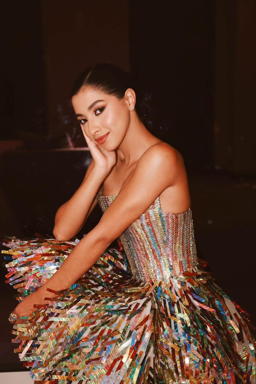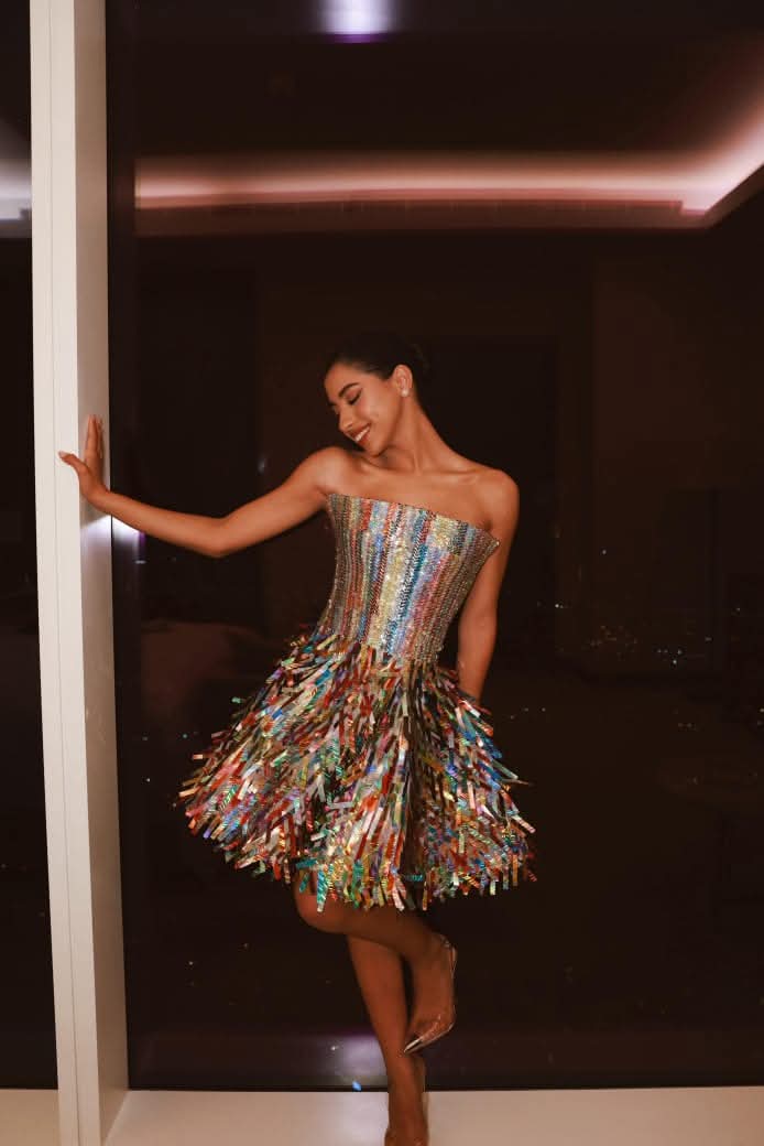 وبدت جيسكا حسام الدين بإطلالة لافته، مرتديه فستان قصير مجسم، صمم من الترتر الملون به بالكامل لتستعرض قوامها الرشيق.