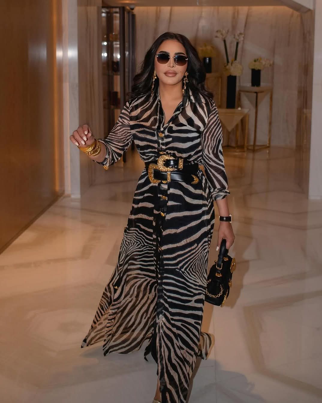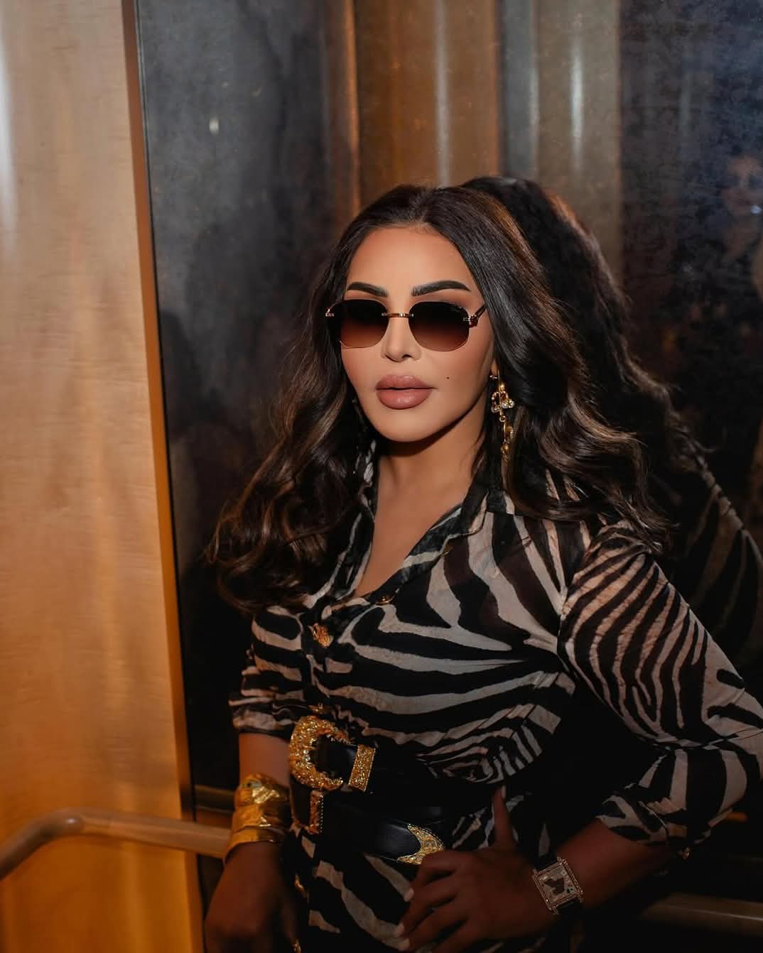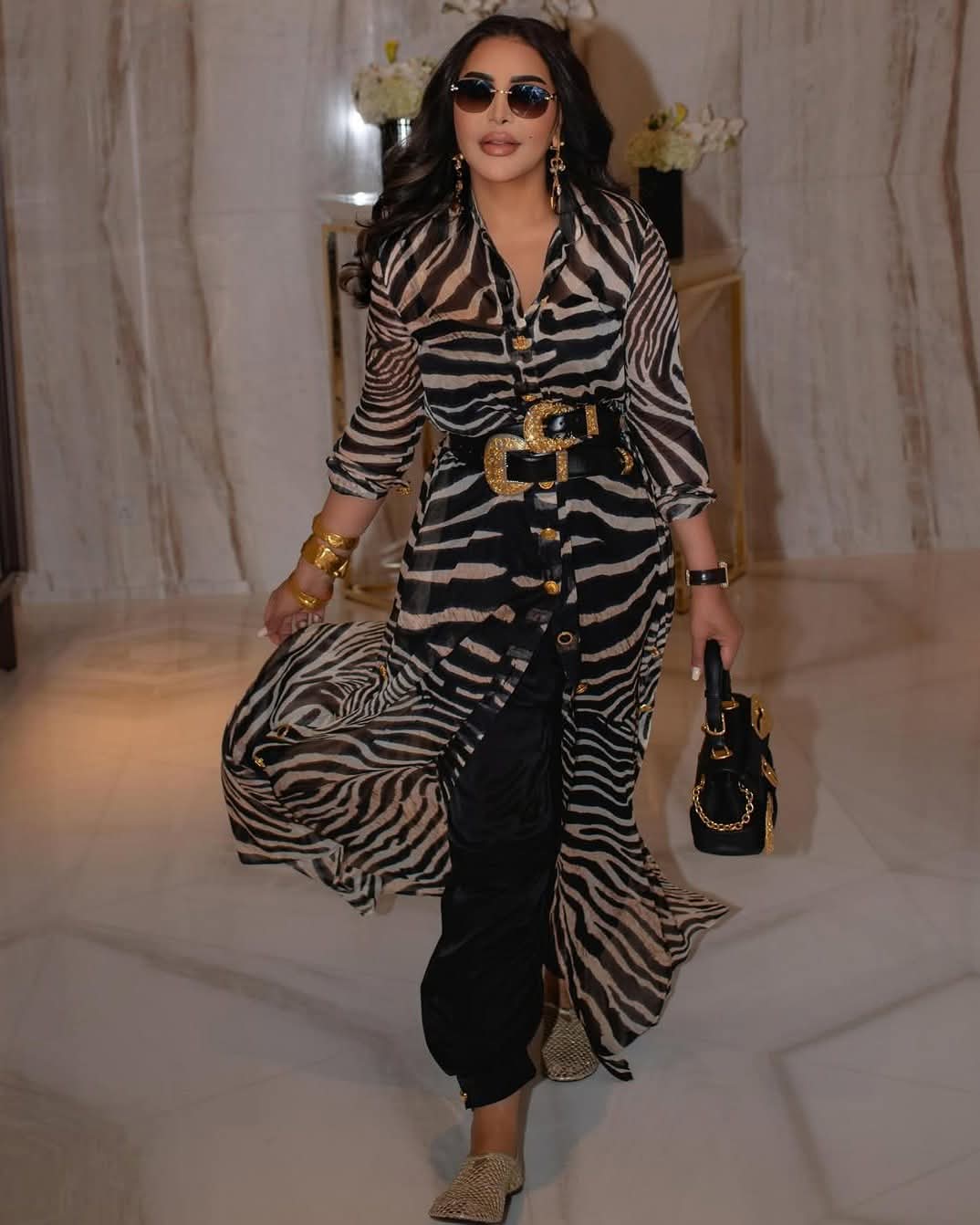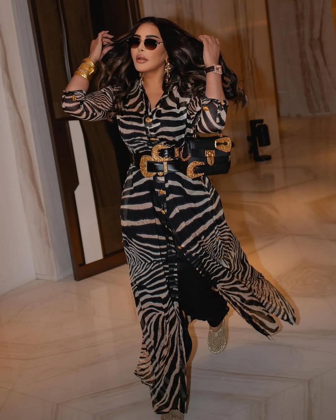 وبدت أحلام الشامسي بإطلالة ساحرة، مزجت بين الأناقة والجاذبية في آن واحد، مرتدية فستان طويل بأكمام طويلة صمم من قماش الحرير بنقشة التايجر لتواكب موضة خريف 2025، يتوسط بحزام عريض حول الخصر.