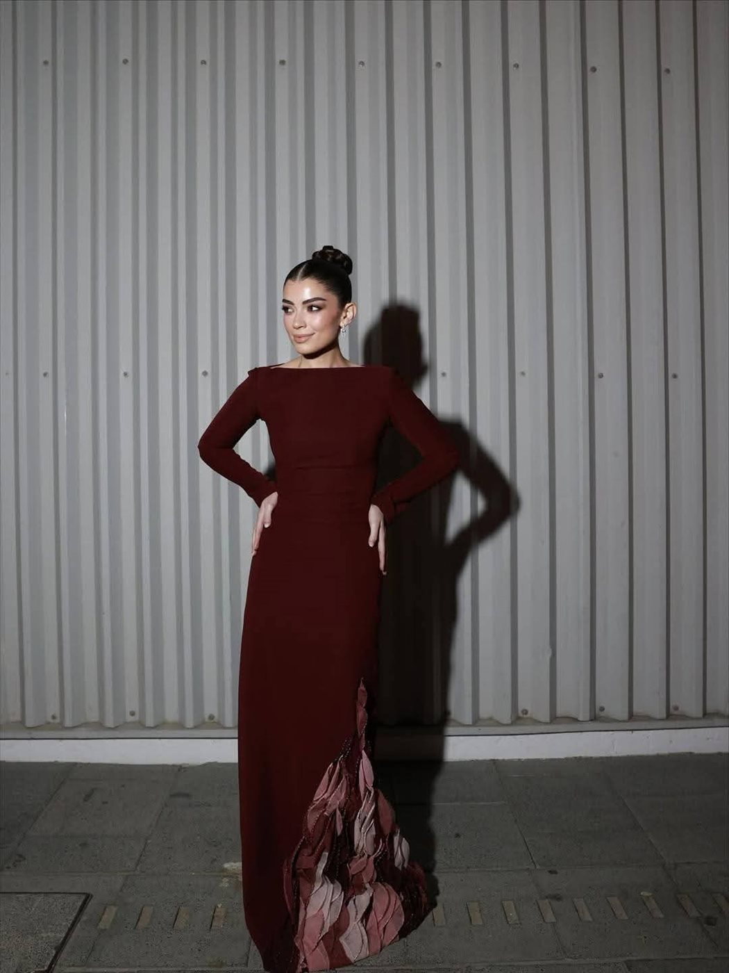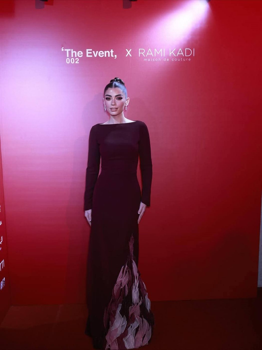 وبدت ليلى أحمد زاهر بإطلالة ساحرة، مرتديه فستان طويل مجسم، بأكمام طويلة، صمم من قماش الكريب باللون البرغندي، الفستان عكس قوامها الرشيق ووزنها المثالي.