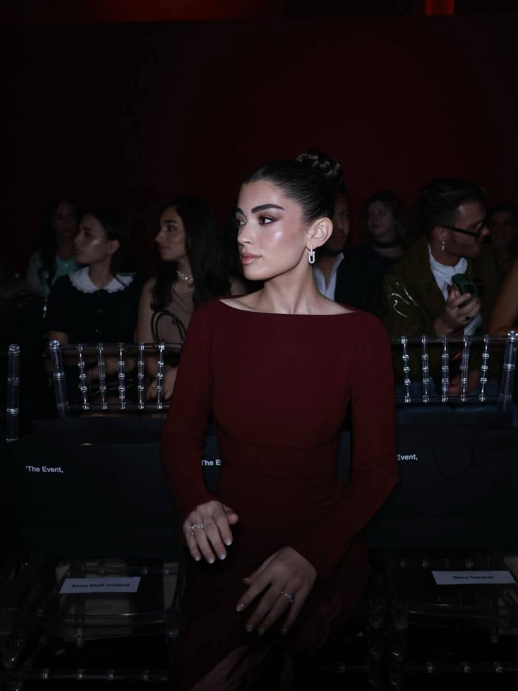 واختارت تسريحة شعر جذابة ووضعت مكياجا جذابًا مرتكزا على الألوان الترابية مع تحديد عينيها بالكحل والماسكرا مع لون الكشمير في الشفاه.