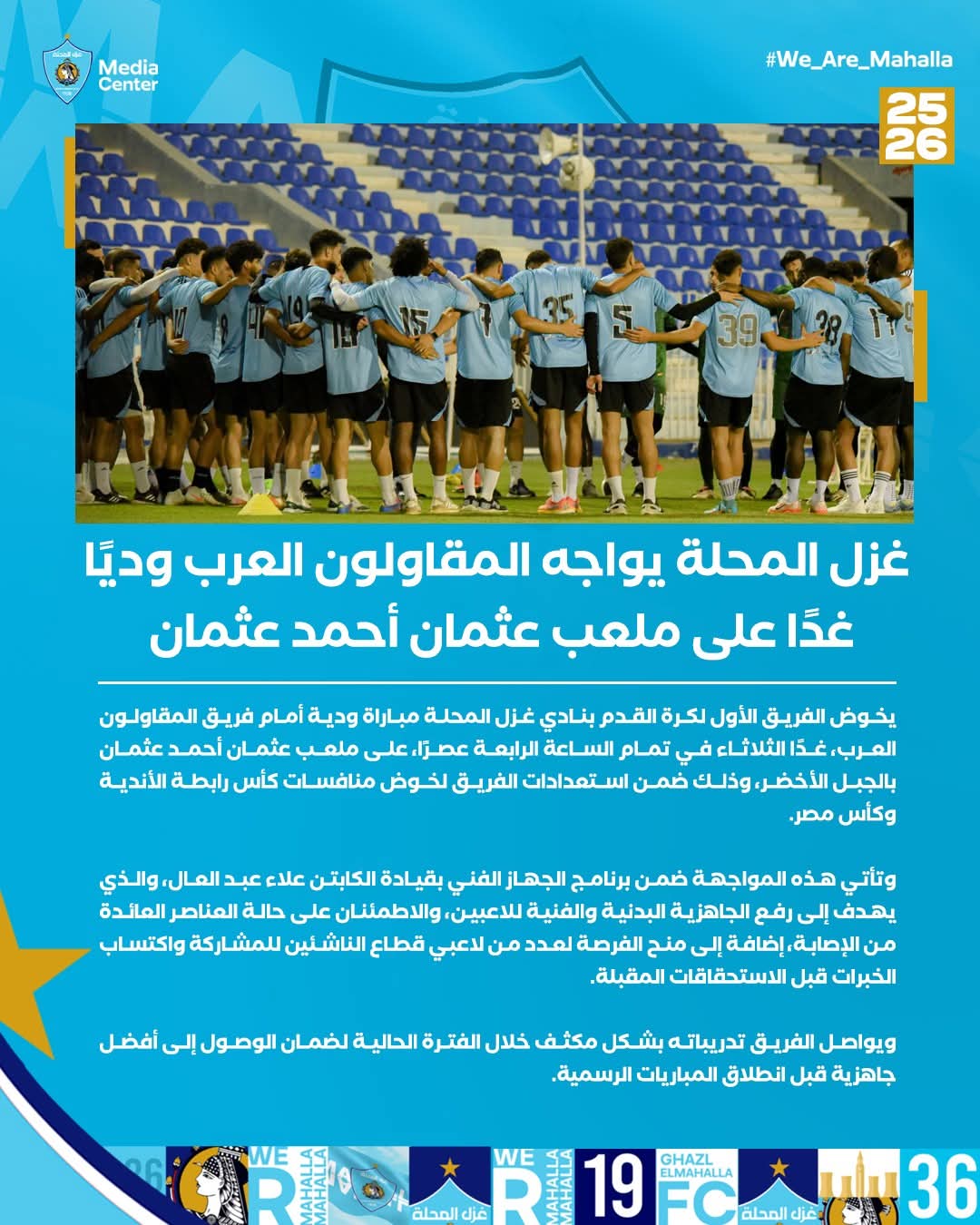 غزل المحلة يواجه المقاولون العرب وديًا غدًا
