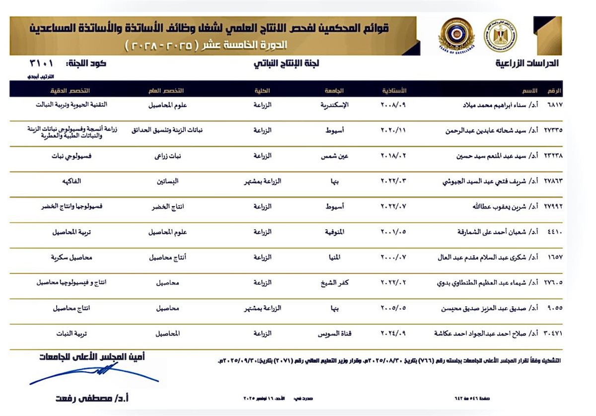 أعلن المجلس الأعلى للجامعات عن اعتماد قوائم المحكّمين الخاصة بفحص الإنتاج العلمي لأعضاء هيئة التدريس المتقدمين للترقية إلى درجتي أستاذ وأستاذ مساعد للدورة الخامسة عشرة (2025–2028)، وشهدت القوائم إعادة اختيار الدكتور شيماء عبدالعظيم بدوي، أستاذ إنتاج وفسيولوجيا المحاصيل بكلية الزراعة – جامعة كفر الشيخ، وذلك للمرة الثالثة على التوالي ضمن لجنة الإنتاج النباتي.